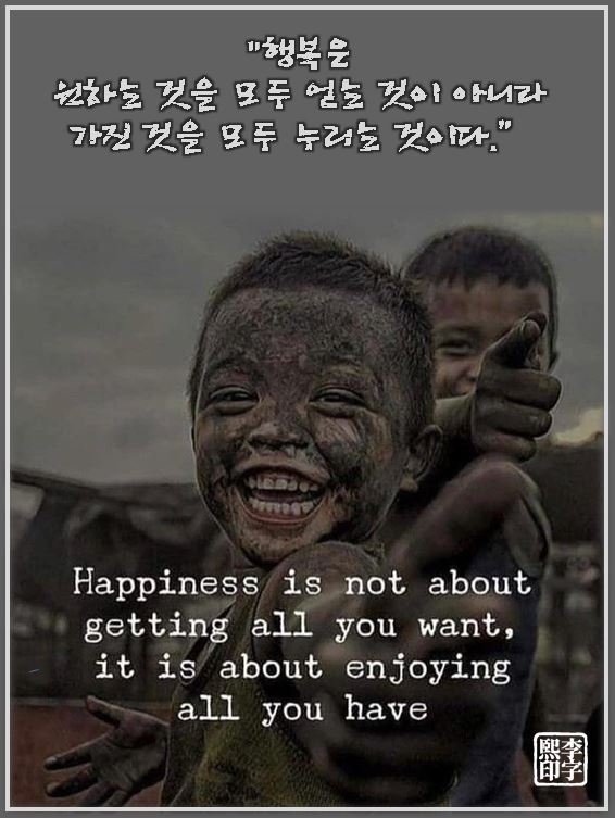 그래서 행복이란?So, How would you define happiness?물리학 분야에서 과학적인 바이오센서를 통해 도파민, 세로토닌 측정 등으로 인간의 행복에 대한 연구를 하여 행복지수(GDH)를 구하는 학자도 있다. 행복과 불행은 번갈아가며 온다. 떄로는 행복의 원인이 시간이 지나며 불행의 원인이 되기도 한다. 행복만 있는 삶도 불행만 있는 삶도 없다. 행복 속에서도 불행이 있고, 불행 속에서도 행복이 있다. 추구한다고 행복해지지 않는다. 불교/유교에서는 지나친 행복 추구는 오히려 욕망으로 해석해 부정적으로 인식한다. 고대 인도에서는 욕망(Kama), 재산(arta), 의무(harma)), 해탈(moksa)을 네 가지를 꼽았다. 유교에서는 수(壽, 장수), 부(富, 재산), 강녕(康寧, 심신 건..