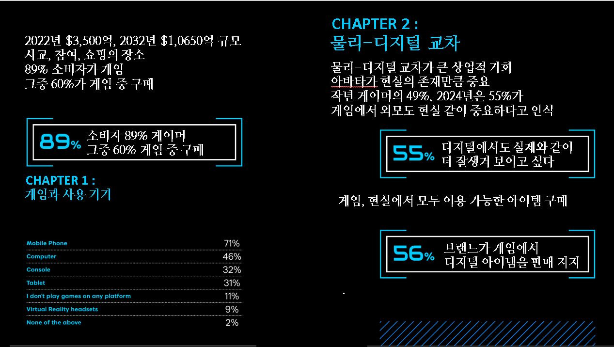 미래 쇼핑객 맞기 14The Future Shopper게이밍 커머스게임은 오랜 주요 산업으로, 2022년 $3,500억에서 2032년 무려 $1,0650억 이를 것으로 예상한다. 사교, 참여, 쇼핑의 장소가 되고 있다. 글로벌 소비자의 몇 %가 전자 기기에서 게임? 놀랍게도 89%로 작년 85%에서 4% 증가했다. 게이머 중 몇 %가 게임에서 돈을 썼을까? 작년 57%에서 올해 60%로 증가했다. 사용 기기로 압도적인 1위는 모바일 폰으로 게이머 71%가 사용한다. 2위는 컴퓨터, 3위는 콘솔이다.물리-디지털 교차가 큰 상업적 기회다. 아바타가 소비자의 물리적 존재만큼 중요하게 여겨진다. 삶의 대부분을 디지털 세계에서 보내면서, 디지털 존재도 점점 더 중요해지고 있다. '잘생겨 보이는 것'을 예로 보면 ..