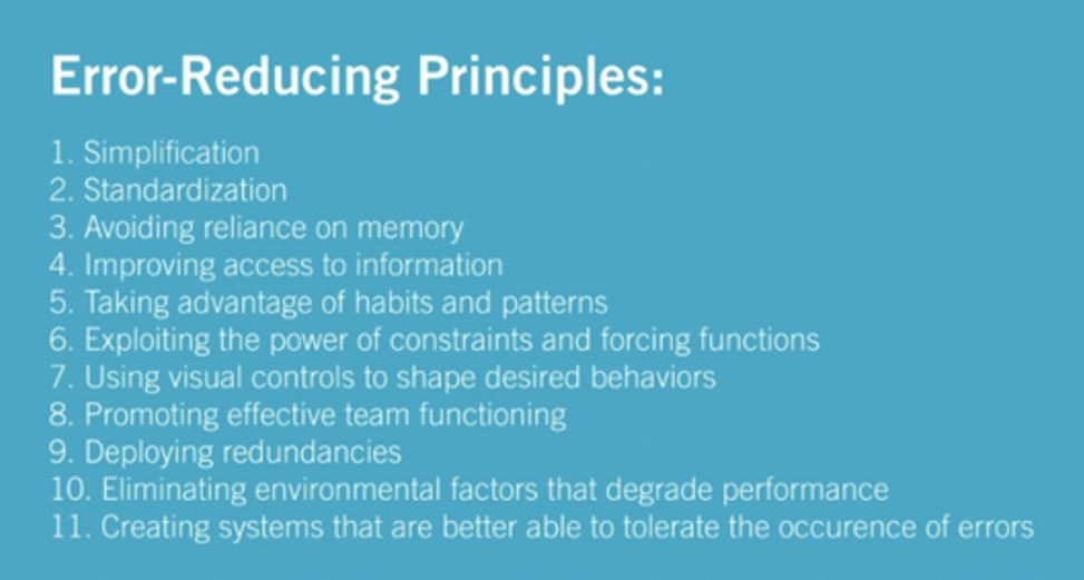 누구나 실수한다 3Everyone makes mistakes■ 실수 요인 분석이유를 알게 되면 해결은 쉽다. 실수가 빈발되는 요인을 살펴보자. ① 불합리 또는 필요 이상의 근무절차 및 공정 ② 주의력을 산만케 하는 소음, 시야 등의 장애 ③ 집중력이 떨어지는 반복적인 업무의 지속 ④ 혼돈을 일으킬 수 있는 기계조작 장치 ⑤ 두 가지 이상을 동시에 하려는 시도 ⑥ 서면 업무지시가 아닌 구두 지시 및 구두 의사소통 ⑦ 지나치게 복잡한 규정 ⑧ 피로, 스트레스 ⑨ 급박한 처리 ⑩ 실수에 대한 과도 문책에 따른 지나친 긴장 ⑪ 완벽주의■ 실수 줄이기 11가지 원칙1. 단순화(Simplification), 2. 표준화( Standardization), 3. 기억 의존 회피(Avoiding reliance on m..