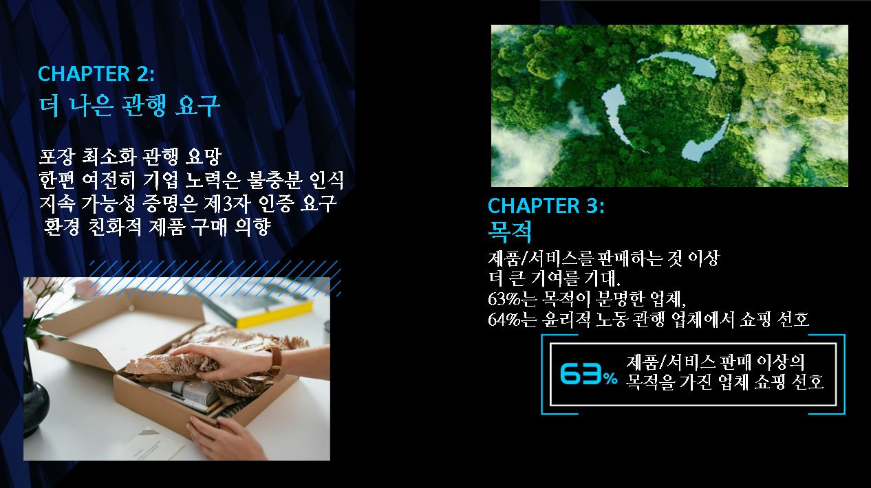미래 쇼핑객 맞기 12The Future Shopper지속 가능성자연재해와 환경 파괴로 지속 가능성이 소비자 행동과 브랜드/소매업체와의 관계에 미치는 영향을 측정하는 것이 합리적이다.지속 가능성이 구매를 주도한다. 56%가 지구 온난화와 환경에 대한 우려로 쇼핑 습관을 바꾸었다고 답했다. 제품을 더 자세히 뜯어보고. 지속 가능성을 위해 제품을 개선하는 기업을 선호한다. 66%가 기후 변화에 대응하려고 제품/서비스를 조정하는 브랜드를 좋아한다고 밝혔다.소비자 67%가 최소 포장 등 더 나은 환경적 관행을 바란다. 지난 4년 추적 결과와 일치한다. 온라인 주문 시 포장 감소 추구 비율은 69%였다. 그러나 여전히 기업이 충분한 노력을 하지 않는다고 믿고 있다. 인증이 도움이 될 수 있다. 제3자 인증을 원한..