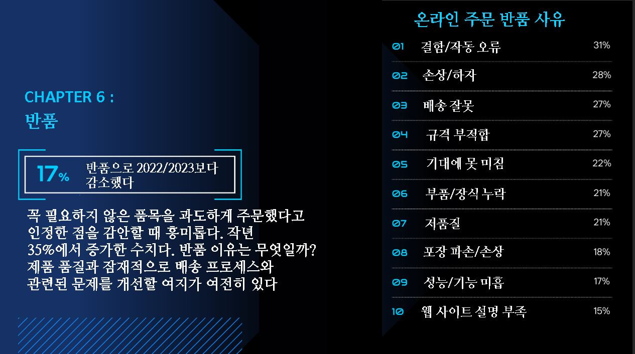 미래 쇼핑객 맞기 9The Future Shopper올바른 고객 경험소비자는 온라인 쇼핑 경험에 불만.거의 3분의 2가 더 즐겁게 만들어 주기를 바란다 답했다. 59%는 시각, 청각, 촉각, 후각, 심지어 미각까지 다양한 감각을 자극하기를 바란다. 새로운 채널/기술을 염두에 두어야 한다. 고객이 원하는 경험과 구매 여정을 잘 이해해야 한다. 온라인:오프라인 어떤 채널이 어떻게 나을까? 온라인 선호도가 압도적이다. 그러나 오프라인 복귀 움직임도 있다. 오프라인은 어느 면에서 나을까? 적절한 제품을 직접 현장에서 가늠하거나 자신에게 맞추어 볼 수도 있고 식음료는 특히 신선도면에서 더 좋다. 물리적 쇼핑이 부활 조짐을 보인다. 경쟁하려면 고군분투해야 한다.온라인 구매는 배송이 매우 중요하므로 개선 여지를 물어..