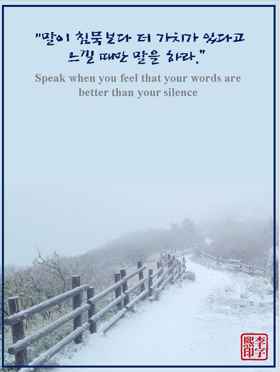 침묵과 말Silence & Words행복하기 좋은 날은 내일이 아닌 바로 오늘이다. 사월 초파일, 5월에 강원도에는 대설특보, 설악산에는 눈이 10㎝ 쌓였다. 어른이 되면 말의 중요성을 더욱 깊이 깨우치게 된다. 한번 뱉은 말은 되돌릴 수 없고 신중하지 않은 말은 큰 화를 불러온다. 부처님은 침묵의 가치를 알려준다. 침묵은 단순히 말을 하지 않는 것 이상의 의미를 지니며 내면의 소리에 귀 기울이고 자기 생각과 감정을 명확히 이해하는 과정이다. 삶의 변화와 도전을 더 깊이 성찰하고 내면의 평화를 찾는 데 큰 도움이 된다.우리의 말은 단순한 소리가 아니라 우리의 마음과 영혼을 반영하는 강력한 도구다. 말은 몸을 치는 도끼와 같아 부주의하게 사용하면 우리 자신뿐만 아니라 타인에게도 해를 끼친다. 하지 않아도 ..