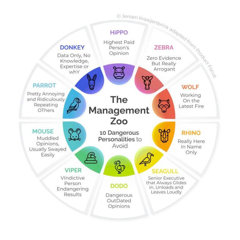 직장은 정글 속의 동물 왕국과 같다. 생태계 전체의 생존에 기여하는 다양한 개인으로 가득하다. 각기 다른 스킬로 조직 성장에 기여한다. 암스테르담 경영대학원의 자문 및 강사인 '제로엔 크라이젠브링크 (Jeroen Kraaijenbrink)'가 만든 '경영자 동물원 인포그래픽'은 직장에서 피해야 할 위험한 성격 유형 10가지를 정리했다. 이러한 성격 유형은 동물원에서 발견되는 동물과 비슷한 약어로 한 재치 있는 발상이 돋보인다.