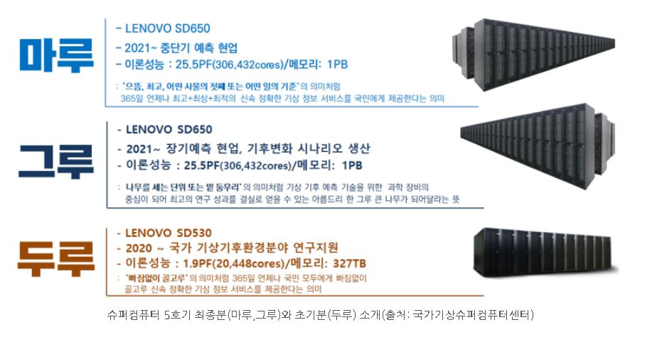 2024년 현재 기상청은 슈퍼컴퓨터 5호기 구루와 마루를 사용하고 있다. 각기 최대 성능은 1.9페타플롭스(초당 1,900조 번 연산), 메모리 용량은 327테라 바이트(TB)다. 56개의 랙으로 이뤄져 총 51 페타플롭스, 2천 TB를 지원한다. 전후 처리 서버와 120대, 로그인 서버 12대와 연결돼 있다. 3천억 원 예산으로 6호기 도입 추진 중이다. 10분 후 날씨부터 10년 후 기후 변화까지 예측한다지만, 신기술이 등장했다. 기상 데이터 입력에서 전 지구 예보가 나오기까지 1분도 안 걸라는 기술이 나왔다. 구글, 엔비디아, 화웨이가 공개한 인공 지능 예보 모델이다. 인공 지능은 방정식을 풀지 않는다. 대신 40년 치 기상 자료를 학습해 스스로 패턴을 추론하고 예보를 내놓는데, 성능은 기대 이상이라는 평이다. '동네 예보'를 보라는 안내가 실감 난다.