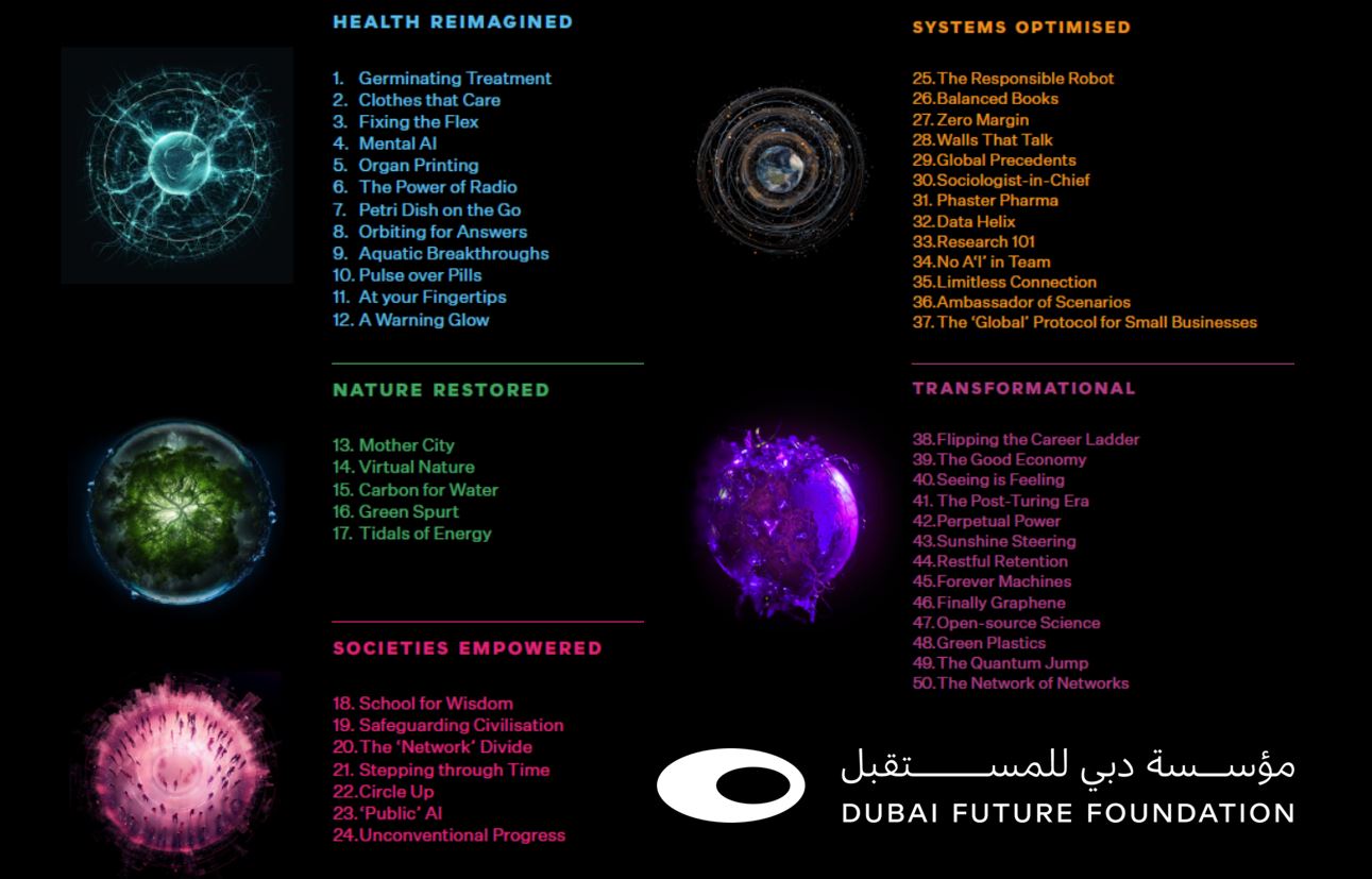 두바이 미래 재단(Dubai Future Foundation)의 '글로벌 50가지 기회 보고서'는 부분적으로 기술 위주지만, 빠르게 변화하는 혁신적 애플리케이션에 대한 글로벌 관점에서 작성되었다. 현재 가장 큰 영향을 주는 메가트렌드 탐색부터 트렌드가 어떻게 미래 성장, 번영, 웰빙에 50가지 기회를 열어주는지 요약했다. “미래를 만들어가는 것은 단지 기다리는 것이 아니라, 최신 기술과 지식 도구를 활용하고 오늘부터 도전에 응함으로써 이루어질 수 있다고 강조한다.