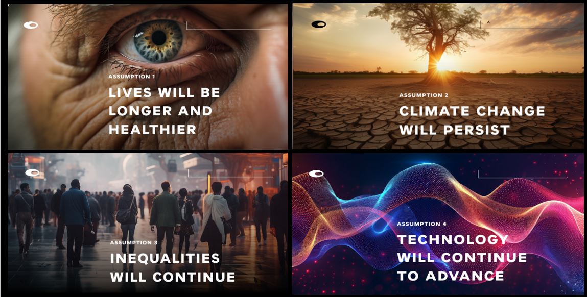 미래 예측은 1. 수명은 늘고 더 건강해진다. 2. 기후 변화는 계속된다. 3. 불평등은 지속된다. 4. 기술은 진보한다, 4가지 전제를 두고 10대 메가트렌드를 짚었다. ■ 1. 재료 혁명(Materials Revolution), ■ 2. 무한한 다차원 데이터(Multidimensional Data), ■ 3. 기술적 취약성(Technological Vulnerabilities), ■ 4. 에너지의 저변(Energy Boundaries), ■ 5. 생태계 보호(Saving Ecosystems), ■ 6. 국경 없는 세계–유동경제(Borderless World – Fluid Economies), ■ 7. 디지털 현실(Digital Realities), ■ 8 자율 로봇/자동화와의 삶(Life with Automous Robots & Automation), ■ 9. 미래 인간성(Future Humanity), ■ 10. 고급 보건의료 및 영양(Advanced Health & Nutrition) 등.