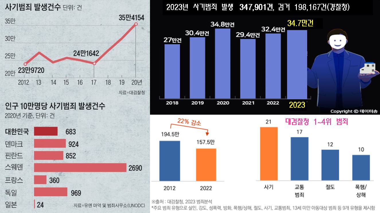 살인, 절도, 폭력, 인신매매 등 범죄 종류는 다양하다. 그중 대한민국에서 가장 많이 발생하는 범죄 1위는 다름 아닌 '사기'이다. 사기죄는 사람을 기망(欺罔, 속임)하여 상대방의 착오를 이용하여, 재물이나 재산상의 이익을 취득하는 대표적인 거짓말 범죄이다. 사기피해가 만연한 대한민국이라며, '모성준' 판사가 2023년 '빨대 사회'란 책을 펴냈다. 사기 조직이 기업화가 되어 업무 분담이 철저하게 이루어지는 무척이나 체계적으로 활개를 치고 있다. 피해가 만연한다. 사기 범죄가 판치는 사회에서 살아가는 우리 사회 구성원들이 꼭 알아야만 하지만, 잘 알지 못한다. 소설가 '오노레 드 발자크(Honore de Balzac)'는 “법은 큰 파리는 잡지 못하고 작은 파리만 잡는 거미줄이다(Les lois sont des toiles d’araignees a travers lesquelles passent les grosses mouches et ou restent les petites)”라고 이야기한 바 있다.