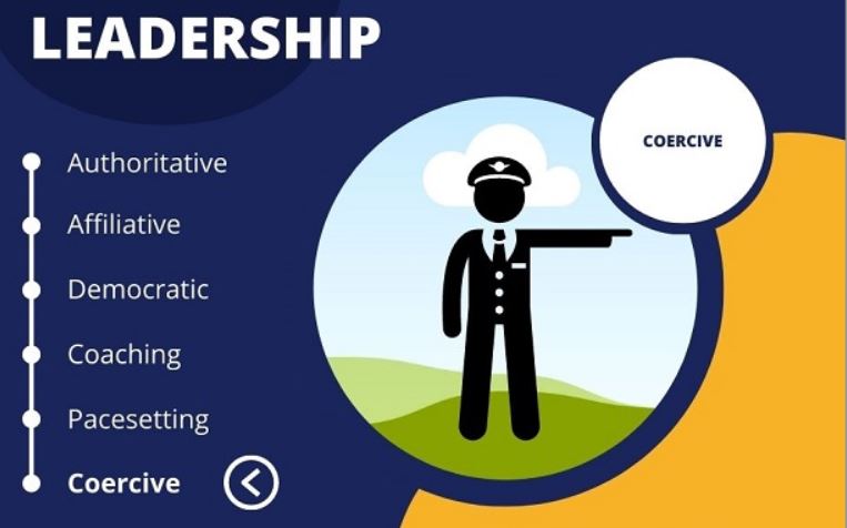 결과를 달성하는 가장 빠른 방법이지만, 댓가를 치르게 된다. 처음에는 두려움으로 결과를 도출하지만 지속 가능하지 않다. 시간이 가면 강압에도 무감각해져 수위를 높이게 되고 종국에는 신망과 신뢰를 잃게된다. 가해자와 피해자 환경은 오래 지탱할 수 없다. 강압적 리더는 완전한 통제권을 갖고 이끄는 무리의 의견을 거의/전혀 받지 않고 결정을 내린다. 독재, 잔인성, 절대 권력/통제는 거부된다.