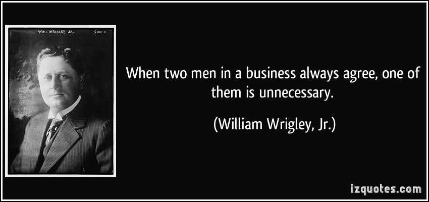 윌리엄 리글리 주니어(William Wrigley Jr.) 말처럼 두 사람이 항상 동의하면 그 중 한 사람은 불필요하다. 서로 동의하지 않을 만큼 관심을 갖고 끝까지 다투며 사실을 파악하는 사람들이 성공을 만들어낸다. 합법적으로 보이지만 강압은 일시 단기적 이익을 주지만 결코 장기적 영향에는 파괴적이다. 겸손, 경청, 재량권 부여, 건강한 경쟁이 바람직하다.