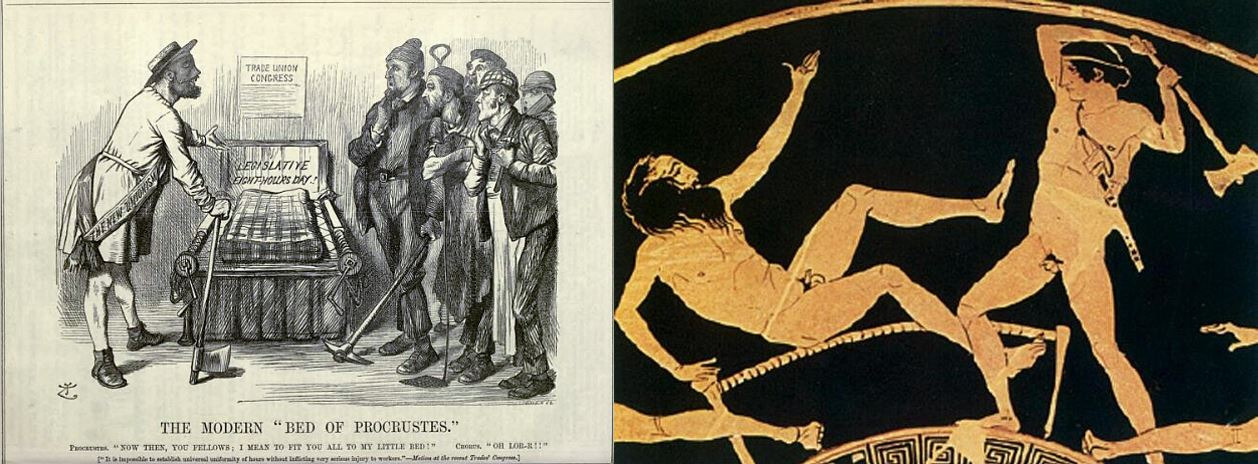 아예 떼거지로 완력을 쓰다 보면 예절은커녕 법도 무시당한다. 트집을 잡고 투정을 부리며 생떼를 쓰는 모양에는 신물이 난다. 그리스 신화에 바다의 신 '포세이돈'의 아들 '프로크루스테스 침대 이야기(Procrustean Bed)'가 있다. 희대의 불한당인 '엘레우시스(Eleusis)'의 여인숙 주인인데 나그네들을 집으로 데려와 배불리 먹이고 잠자리에 누우면 침대보다 손님이 크면 잘라 죽이고, 작으면 늘려 죽였다. 자신의 이론, 생각, 정책에 획일적으로 맞추는 억지(어거지)가 아직도 도처에서 일어 난다.