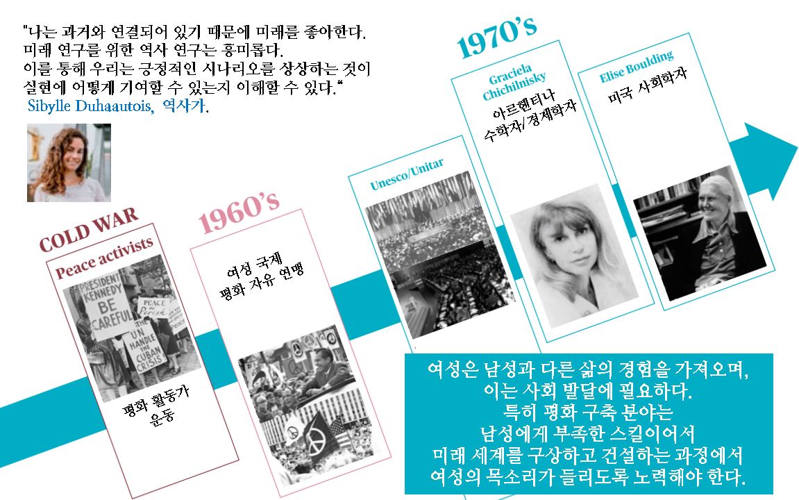 "여성은 미래를 상상함으로써 모든 사람에게 더 공정한 미래를 만드는 데 도움을 준다." 역사가 Sibylle Duhaautois는 미래의 문제와 유익한 방식의 아이디어를 연구해 왔다. 특히 내일의 비밀을 적극적으로 찾는 여성의 역할을 제시한다. 냉전 시대에 평화주의 여성 운동가들은 어떤 국가나 기업도 미래의 가장 중요한 문제를 해결할 수 없다고 믿었다. 장기적 이슈를 논의하여 미래 자원을 확보할 수 있는 시나리오를 만들었다. 1960년대에 '여성 국제 평화 자유 연맹'이 등장하여 핵 미래에 대한 두려움을 불러일으키는 것보다 여론과 의사 결정자를 설득하는 더 나은 방법이라고 설명했다. 1970-80년대에 UNESCO, Unitar, 기타 국제기구는 예측 프로그램 창안을 통해 글로벌 미래에 대한 관심을 제도화했다. '미래에 관한 프로젝트'가 탄생했다. 공유된 미래에 대한 개인의 가치와 선호를 표현하는 방법이 분명해졌다. 아르헨티나의 수학자/경제학자 Graciela Chichilnisky는 글로벌 최적화를 위한 모델 생성에 참여하여 환경을 존중하며 자원을 분배하여 개발하자는 주장을 펼쳤다. 미국 사회학자 Elise Boulding은 여성은 남성과 다른 삶의 경험을 가져오며, 이는 사회 발달에 필요한 것이라고 주장했다.