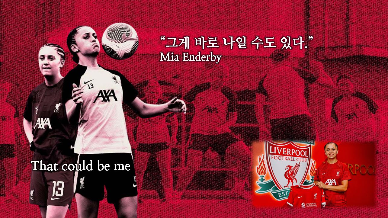 2021-22년 유망 선수상을 받은 18세 Mia Enderby는 2023년 7월 영국 여성 축구 셰필드 유나이티드팀을 떠나 리버풀의 포워드로 적을 옮겨 슈퍼 리그 선수의 꿈을 이루었다. 여자 국가대표팀 라이오네스(Lionesses)의 성공 덕분에 여성 축구는 상승세고 어린 소녀들의 동경 대상이 되었다. 여성 리그도 훈련장, 경기장, 맞춤형 시설도 늘어나고 젊고 재능 있는 선수단에 대한 관심도 높아졌다. 축구가 좋아 남자아이들과 뛰면서, 안팎의 편견에 많은 희생을 했다. 13세 남동생도 팬이 되고, 올해 첫 프로 리그에 최선을 다하고 있다. 미래에 대해 그녀는 특별한 가치를 두고 있다.