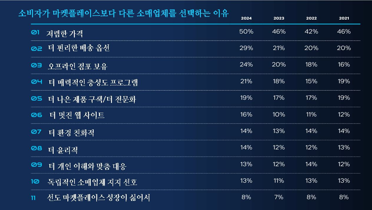 온라인 마켓플레이스는 구매자와 판매자를 연결하여 상품이나 서비스에 대한 거래를 수행할 수 있는 플랫폼이다. 성공 핵심은 여러 채널의 효율적 운영 능력이다. 그래서 마켓플레이스는 중요한 부분이다. D2C 같은 다른 채널은 어떨까? 소비자가 마켓플레이스에 집착하지 않도록 하려면? 다른 소매 채널을 선택하게 하는 요인은? 핵심 동인은 가격이다. 가격, 편리한 배송이다. 그리고 실제 매장 보유도 바란다. 브랜드/소매업체 자체 사이트를 통해 여러 브랜드를 홍보하고 판매하는 브랜드 마켓플레이스는 어떨까? 소비자가 새로운 종류의 마켓플레이스에 만족할까? 답은 확실히 'YES'다.