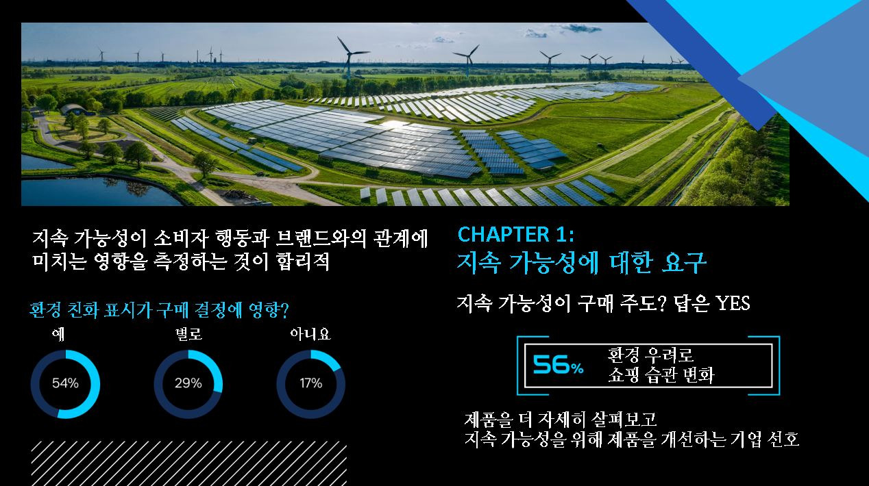 지속 가능성이 구매를 주도한다. 56%가 지구 온난화와 환경에 대한 우려로 쇼핑 습관을 바꾸었다고 답했다. 제품을 더 자세히 뜯어보고. 지속 가능성을 위해 제품을 개선하는 기업을 선호한다. 66%가 기후 변화에 대응하려고 제품/서비스를 조정하는 브랜드를 좋아한다고 밝혔다.