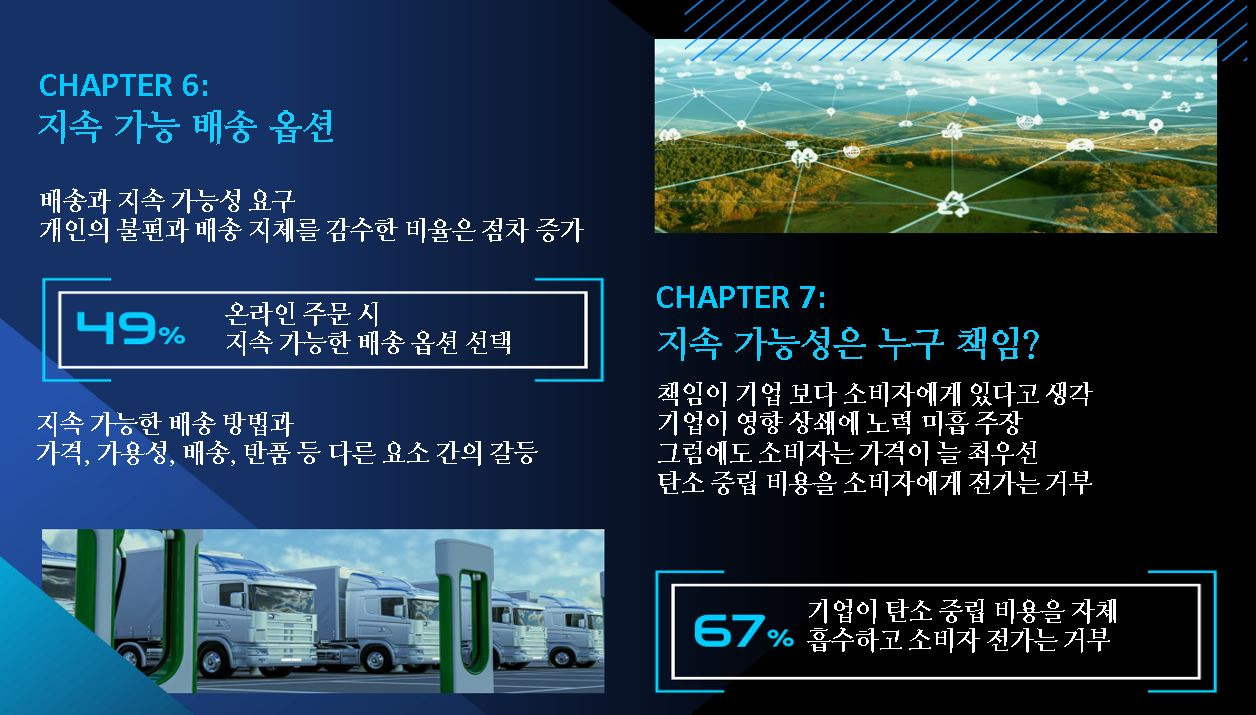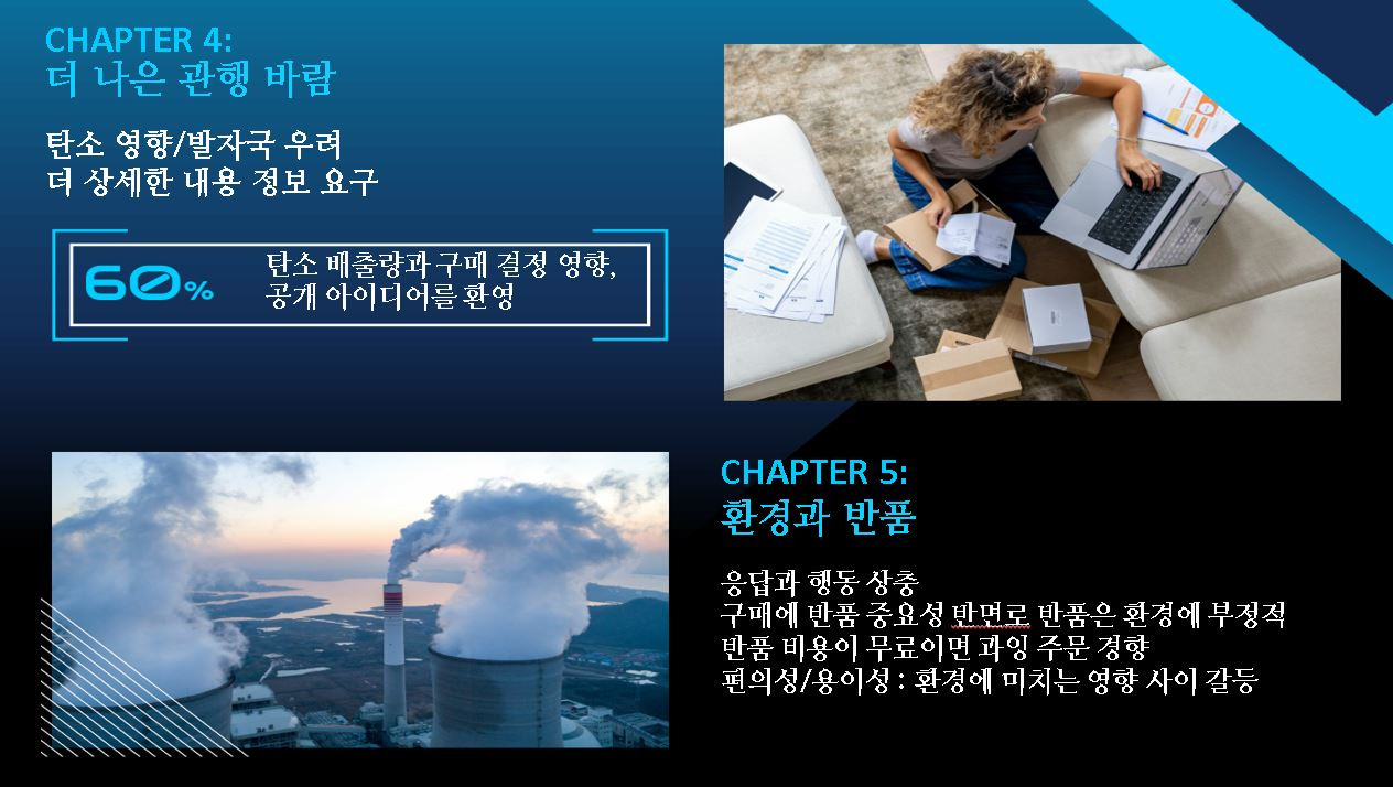 탄소 영향/발자국 우려가 크고, 62%는 제품의 배출 CO2, 사용 재료, 이동 거리 등에 대해 더 자세히 알고 싶어한다. 60%는 탄소 배출량/영향 공개 아이디어를 환영하고, 48%는 탄소 배출량에 대한 이해 부족으로 홍보/교육이 필요하다. 의향과 행동이 상충되기도 한다. 구매에 반품 중요성을 중시하지만 반품은 환경에 부정적인 영향을 미친다. 49%는 반품 비용이 무료면 과잉 주문하는 경향이 있다.. 45%만 환경에 나빠 반품하지 않았다고 주장한다. 편의성/용이성과 환경에 미치는 영향 사이에서 갈등을 겪고 있다.