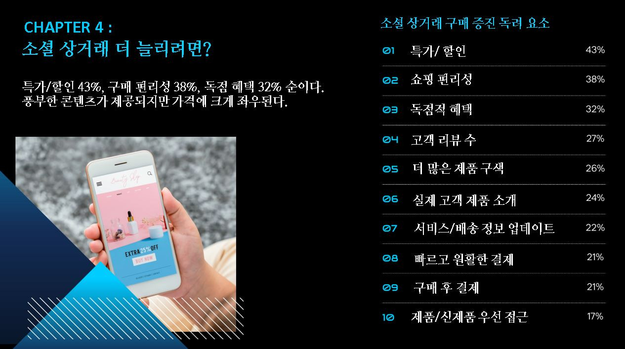 소셜 상거래를 더 늘리려면? 플랫폼 선호도는 분명하지만, 독려 요소는? 특가/할인 43%, 구매 편리성 38%, 독점 혜택 32% 순이다. 콘텐츠가 풍부하지만 그보다 소비자는 가격에 크게 영향을 받는다. 구매 경험을 정말로 완벽하게 구현하면, 마음을 사로잡고 신속한 거래로 사랑을 받을 것이다.