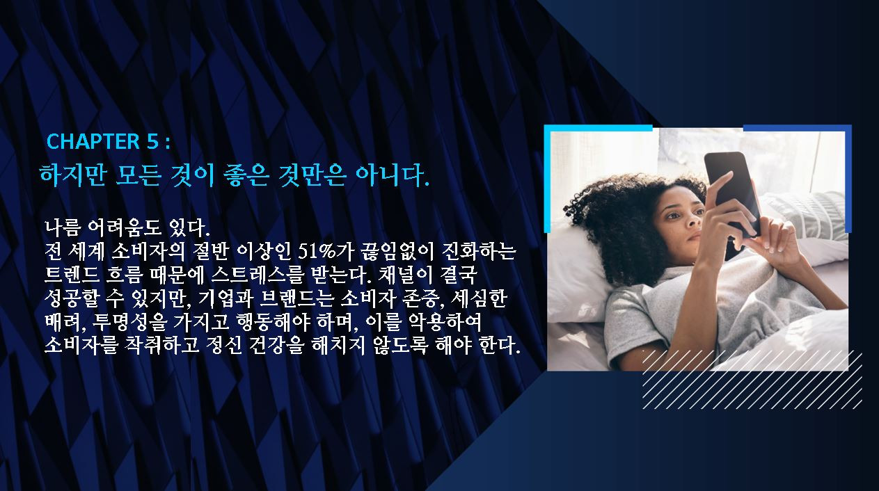 소비자 51%는 끊임없이 진화하는 트렌드 때문에 스트레스를 받는다.기업/브랜드는 소비자 존중, 세심한 배려, 투명성을 가지고 행동해야 하며, 이를 악용하여 소비자를 착취하고 정신 건강을 해치지 않도록 해야 한다.