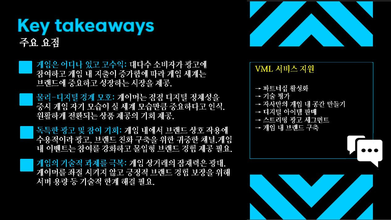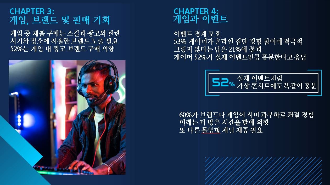 게임 중 제품 구매도 스킬이지만, 광고와 관련이 있다. 게임에 몰두하여 참여하는 시장에서 시기와 장소에 적절하게 브랜드가 노출되어야 한다, 특히 52%가 게임 내 광고 브랜드에서 구매할 가능성이 더 높다. 이벤트도 경계가 모호해졌다. 2024년 6월 이틀 동안 Metallica는 Fortnite에서 가상 콘서트를 열었다. 인기 6곡이 담긴 연주가 테마 게임과 매치되었다. 53%가 온라인 집단 경험 참여에 적극적이며 그렇지 않다는 답은 21%에 불과했다. 52%는 실제 이벤트만큼 가상 콘서트에도 똑같이 흥분한다고 밝혔다. 하지만 적절한 준비/관리가 필요하다. 에미넴의 포트나이트 이벤트는 서버가 수요 감당이 어려워 어려움을 겪어, 실망과 불만이 컸다. 60%가 서버 과부하로 좌절감을 느낀다. 미래는 더 많은 시간을 할애할 것이라고 답해 잠재 고객과 소통하는 또 다른 몰입형 채널이 제공되어야 할 것이다.