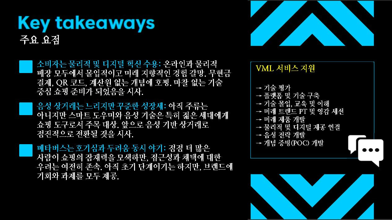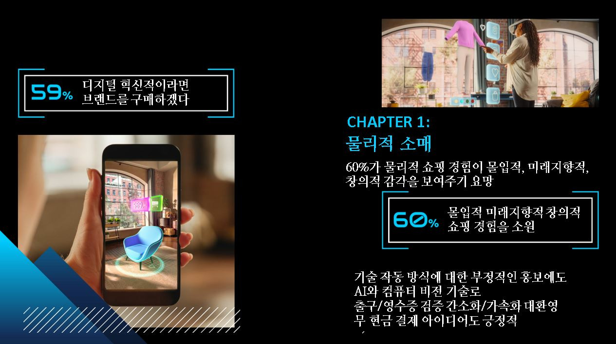 쇼핑 경험에 종종 실망스러운 소비자의 미래는 어떻게 될지, 무엇을 원하는지? 소비자 59%는 디지털 혁신적이라면 브랜드를 구매할 가능성이 더 높다고 답해 중요한 사안이다. 물리적 쇼핑 경험은 여전히 중요한 역할을 한다. 추가적인 화려함을 보강해야 한다. 소비자 60%가 물리적 쇼핑 경험이 몰입적, 미래지향적, 창의적 감각을 보여주기 원한다. 기술 작동 방식에 대한 부정적 홍보에도 Amazon Go는 긍정적으로 여긴다. 66%는 줄을 설 필요가 없는 매장에 흥분한다. 월마트 회원제 창고형 Sam's Club은 120여 개 매장에 AI와 컴퓨터 비전 기술을 구축하여 출구/영수증 검증 절차를 간소화/가속화했다. 무현금 결제 아이디어도 긍정적이다. 59%가 아주 좋다고 말했고, 52%는 안면, 손바닥, 눈 등 신체 부위를 사용한 결제를 환영했다.