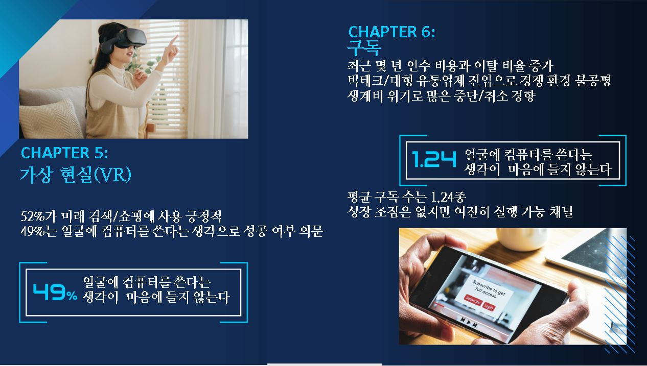 이미 VR 헤드셋은 10년 이상 사용되어 유용하게 다듬어지고 있다. 52%는 미래에 검색/쇼핑에 활용하는데 긍정적이다. 49%는 VR 헤드셋이 얼굴에 컴퓨터를 쓴다는 생각으로 성공하지 못 할 것으로 답했다. 구독 서비스는 많지만 실제 성공 여부에 대한 논쟁이 끊이지 않는다. 분석하기도 어렵고 인수 비용/이탈 비율이 높아졌고, 빅테크가 진입하여 경쟁 환경이 공평하지 않다. 생계비 위기로 많은 소비자가 중단/취소했다. 구독 비율은 작년과 똑같이 56%다.