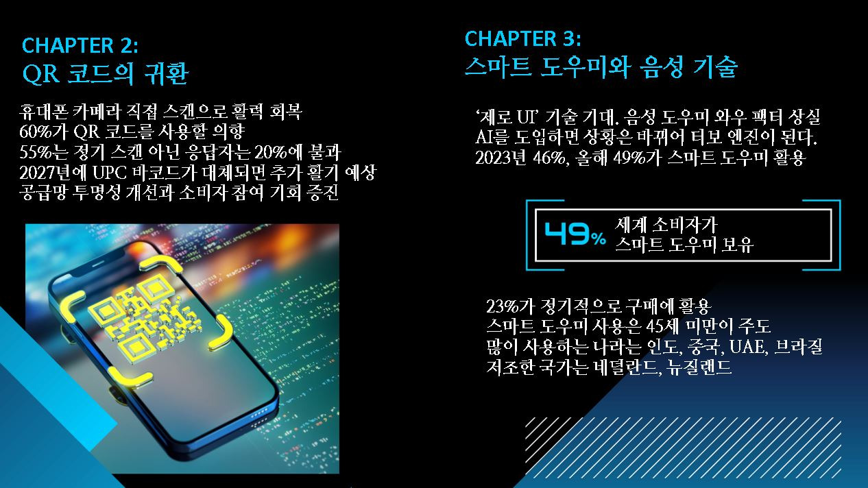 오래된 기술인 QR 코드는 어떨까? 휴대폰 스캔 기능으로 활력을 되찾았다. 60%가 QR 코드 사용할 가능성이 더 높다고 답했다. 속도/규모에 맞춘 스캔이 진행 중이다. 55%는 정기 스캔, 그렇지 않다는 20%에 불과하다. 2027년 기존 UPC 바코드로 대체되면 더 활기를 얻을 것이다. 체크아웃 시스템과 모바일 폰으로 공급망 투명성 개선과 소비자 참여 기회를 늘려줄 것이다. 거의 10년 ‘제로 UI’ 기술을 기대해 왔다. 음성 도우미의 와우 팩터는 사라졌다. 거의 기기는 쇼핑 컨시어지를 더 닮아가면서 터보 엔진이 될 것이다. 2023년에 46%, 올해는 49%가 스마트 도우미를 활용하고 있다. 실제로 정기적으로 제품 주문에 사용한다. 45세 미만이 사용을 주도하고 가장 많이 이용하는 나라는 인도 42%, 중국 34%, UAE/브라질 32%. 가장 저조한 국가는 네덜란드/뉴질랜드 9% 수준이다.