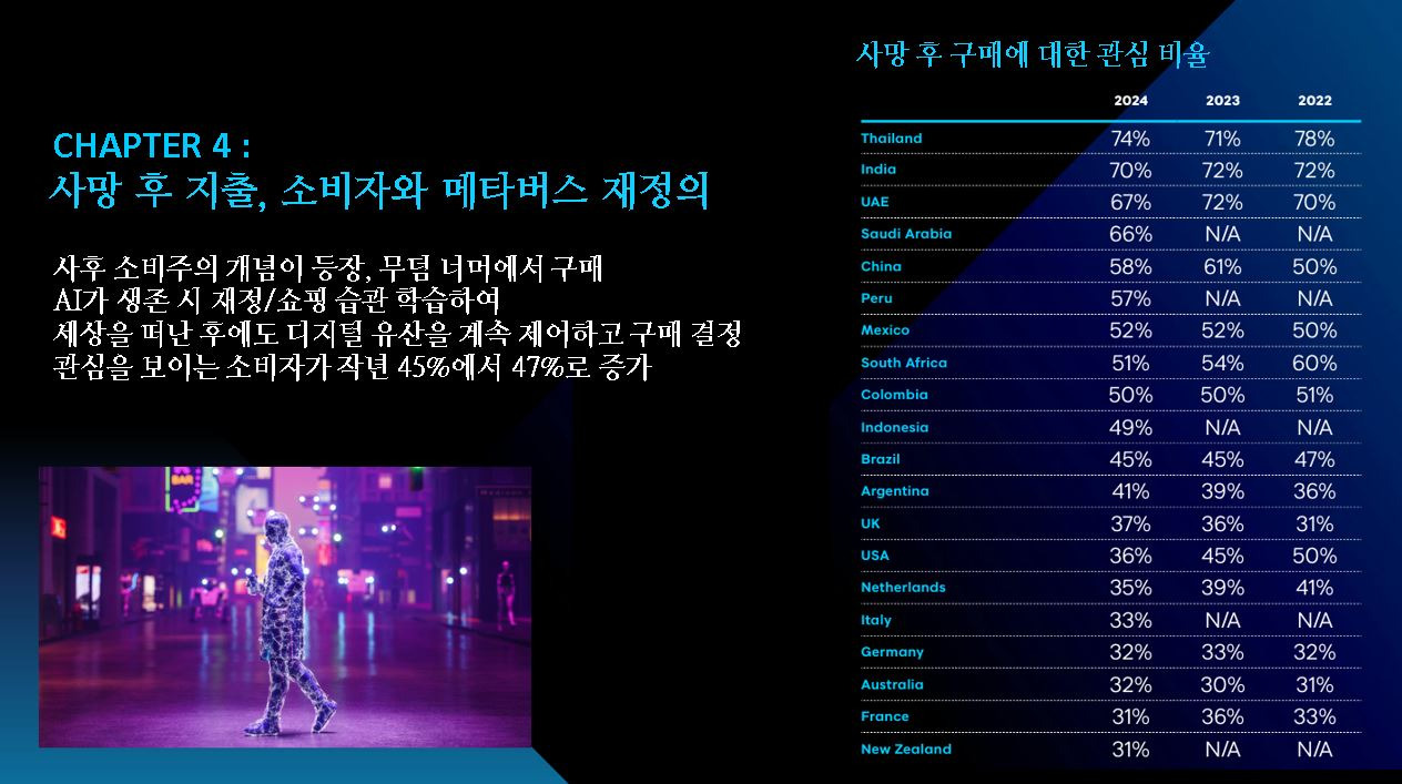 세상은 소비자와 상호작용에 대해 의문을 제기하고, 도전하고, 재정의하도록 강요한다. 대기업 고객 상담실에 전화를 걸면 AI 챗봇과 통화하게 된다. 로봇이 이미 대기 중이다. '사후 소비주의' 개념이 생겨났다. AI가 생존 시의 재정/쇼핑 습관을 학습하고, 세상을 떠난 후에도 디지털 유산을 계속 제어하고 구매 결정을 내린다. 관심을 보이는 소비자의 비율도 대단하다. 작년 45%에서 47%로 증가했다. 사랑하는 사람이 세상을 떠난 후 기리고 구매한다는 생각에 기반을 두지만 나이가 들수록 관심이 덜하다는 점이 흥미롭다.