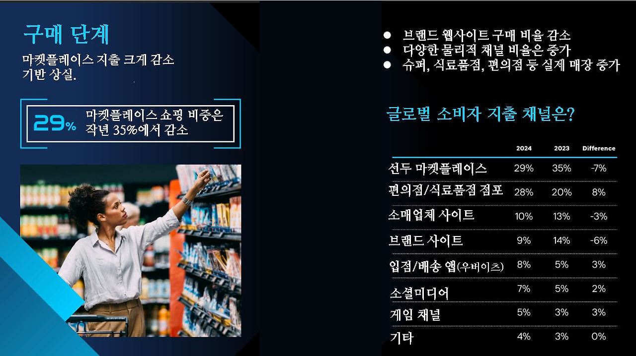 마켓플레이스가 여전히 1위지만, 쇼핑 비중은 작년 35%에서 크게 감소하여 29%를 기록했다. 이탈 문제가 다시 한 번 나타나는 것인가? 기타 슈퍼마켓, 식료품점, 편의점 등 다양한 물리적 실제 매장에서의 지출 비율이 모두 증가하고 있다.