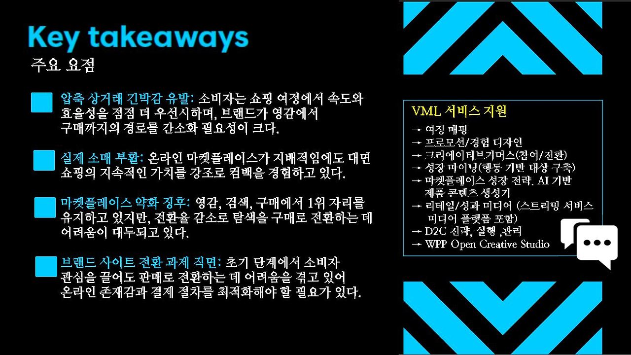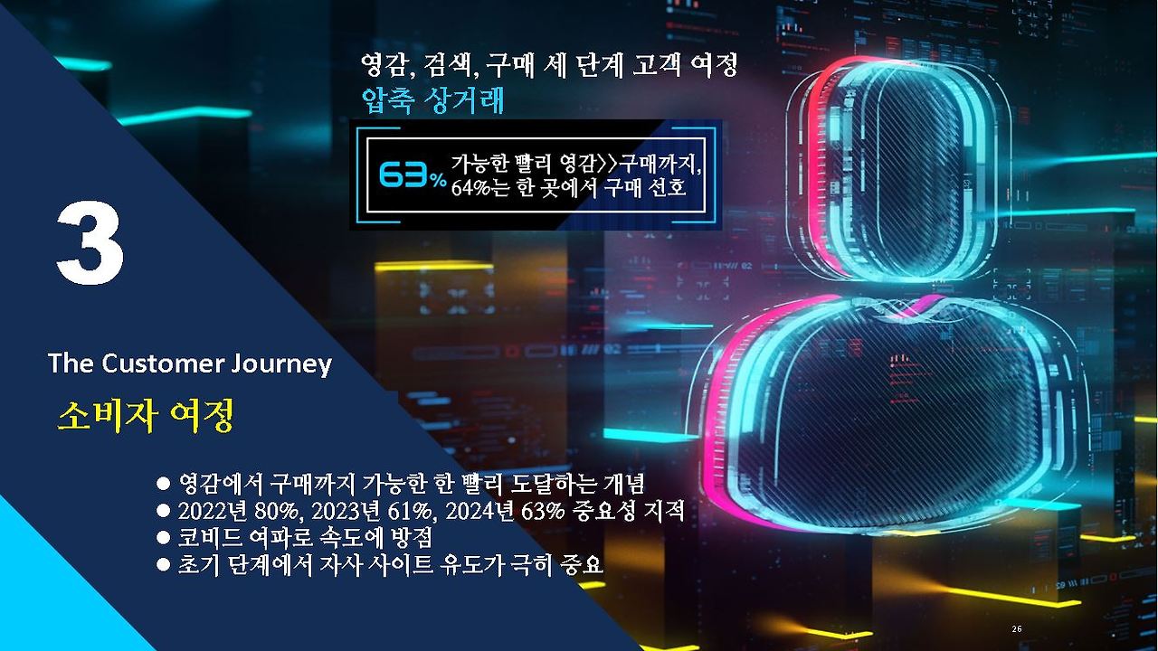 온라인 쇼핑 트렌드를 파악하기 위해 영감, 검색, 구매의 세 단계로 정리된 간단한 고객 여정을 살펴보면 단연 '압축상거래'란 단어로 집중된다. 영감에서 구매까지 가능한 한 빨리 도달하는 개념으로, 즉 고객 여정을 압축하는 것이다. 소비자는 가능한 빨리 영감 획득에서 구매까지 달리고 싶다. 한편 구매는 64%가 한 곳에서 다 하는 것을 선호한다.