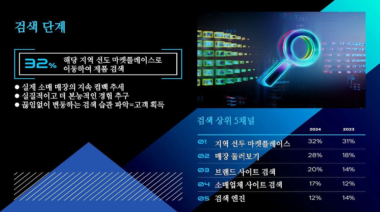 해당 지역 선도 마켓플레이스로 이동하여 제품 검색을 하지만, 실제 소매 매장 둘러보기가 컴백 추세다. 실질적이고 더 본능적인 경험을 원한다. 브랜드20%. 소매업체 사이트도 17%로 상승했다. 검색 엔진은 계속 크게 감소 중이다. 변동하는 검색 습관을 파악해야 고객 획득 전략에 성공할 수 있다.