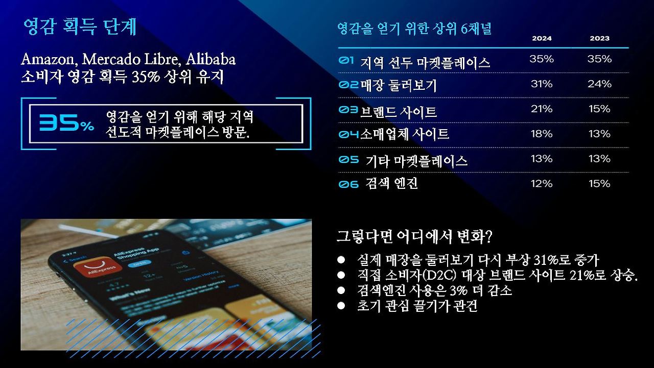 여전히 각 지역 주요 마켓플레이스인 Amazon, Mercado Libre, Alibaba 등이 35%로 상위를 유지하고 있다. 그러나 실제 매장을 둘러보기가 31%로 증가했다. 코비드 이후 실제 쇼핑 경험을 갈망한다는 증거다. 직접 소비자(D2C) 대상 브랜드 사이트도 21%로 상승했다. 반면 검색엔진 사용은 3% 더 감소했다. 이 단계에서 관심 끌기가 경쟁에 관건이다. 수많은 채널이 경쟁한다. 자사 사이트에서 영감을 얻을 수 있도록 노력해야 한다.