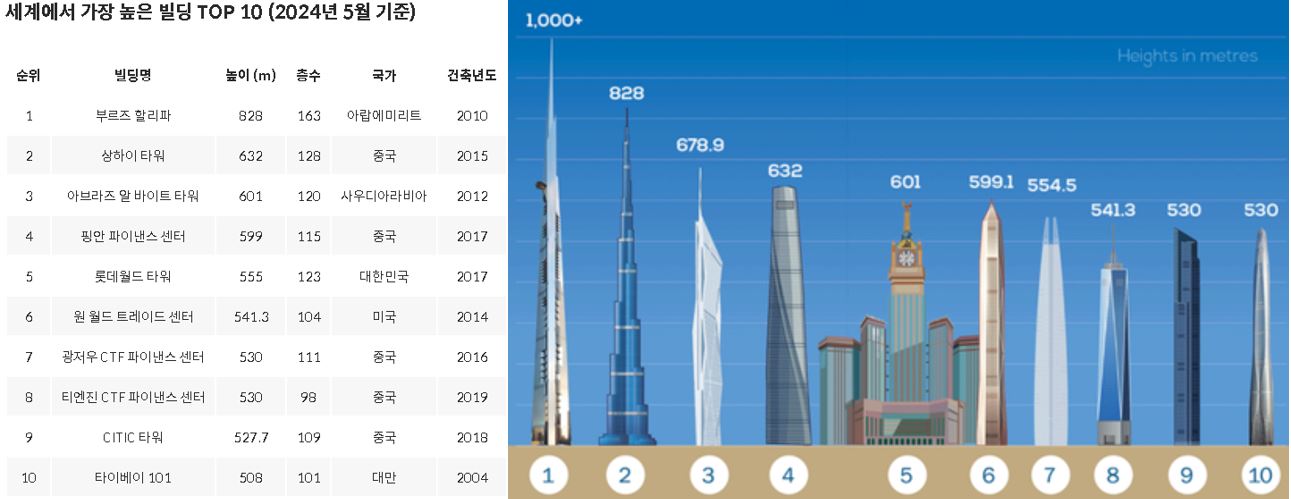 세계 최고층 기록이 계속 경신되면서 왕년의 '엠파이어스테이트' 빌딩, 시어스 빌딩 순위는 계속 밀리고 있다. 2008년 8월 시점에서 1위는 '타이페이101'였으나, 지금은 10위다. 사우디 Jeddah에 세워질 '제다타워(The Mile High Building)"는 높이가 1,600미터에서 1,008미터로 수정 2029년 완공 예정이다. 인간의 욕망, 마치 바벨탑같이 끝없이 올라가다 무너지는 것은 아닐까? 약간의 문제는 있겠으나 이런 경쟁은 빙산의 일각에 불과하다. 왜냐하면 상상을 초월하는 신소재들이 출현하고 있기 때문이다.