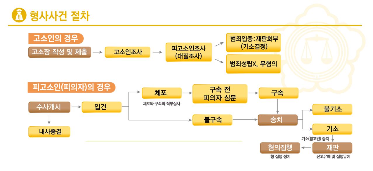 법적 절차는 일반적으로 범죄의 증거 수집을 위한 법 집행 기관의 조사로 시작된다. 증거가 충분하면 사건은 검사의 기소 단계로 넘어간다. 그다음 피고인은 유죄, 무죄 또는 무혐의를 주장하는 기소 절차를 거친다. 재판 전에 합의가 이루어지면 기각되고 아니면 재판으로 진행된다. 변호인과 검찰 모두 증거와 주장을 제시하고 배심원 또는 재판의 경우 판사가 평결을 내린다. 범죄 혐의로 기소된 개인은 법적 절차의 공정성을 보장하기 위해 법에 따라 몇 가지 권리가 있다. 공정한 공개 재판을 받을 권리, 변호인의 도움을 받을 권리, 묵비권을 행사할 권리, 배심 재판을 받을 권리, 유죄가 입증될 때까지 무죄로 추정될 권리 등이다.