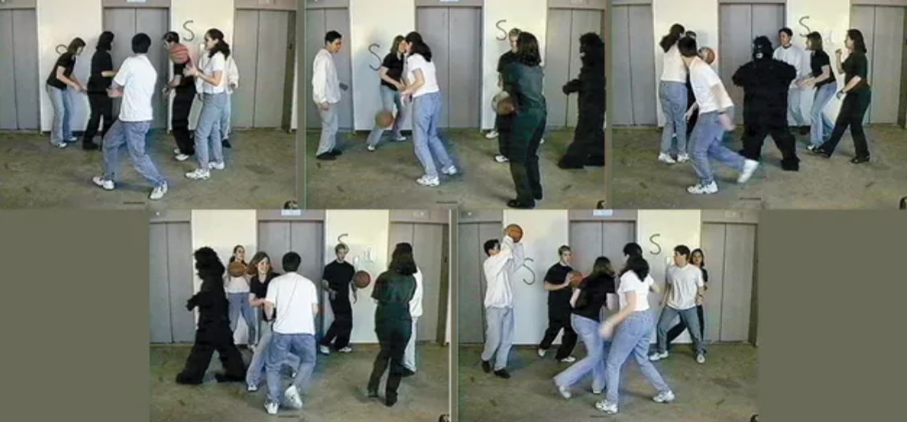 6명의 학생을 두 팀으로 나누어 하얀색/검은색 셔츠를 팀별로 입히고 서로 농구공을 패스하도록 했다. 동영상으로 찍어서 보여준 후 검은색 패스는 무시하고 흰색 팀이 한 패스의 수를 세도록 했다. 그리고 '혹시 고릴라를 보았는지?' 질문했다. 반 이상이 고릴라를 보지 못했다고 답했다. 사실은 중간에 고릴라 의상을 입은 학생이 중앙에서 가슴을 두드리며 킹콩 흉내를 내었다. 알려주고 다시 살펴보도록 하니 그제야 고릴라가 보였다. 고릴라를 보지 못한 것은 패스에 집중하라는 지시 때문이다. 한 가지에 집중하면 명백히 존재하는 다른 것을 보지 못하는 인지적 착각의 일종이다.