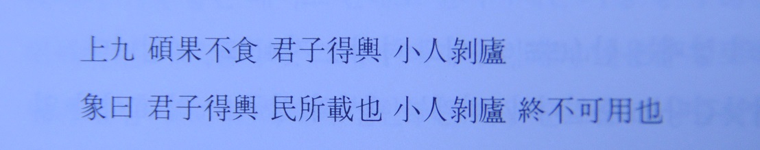 씨 과실은 먹지 않는다. 군자는 가마를 얻고 소인은 거처를 앗긴다. 군자는 가마를 얻고 백성의 추대를 받게되고 소인은 거처를 앗기고 종내 쓰일데가 없어진다.