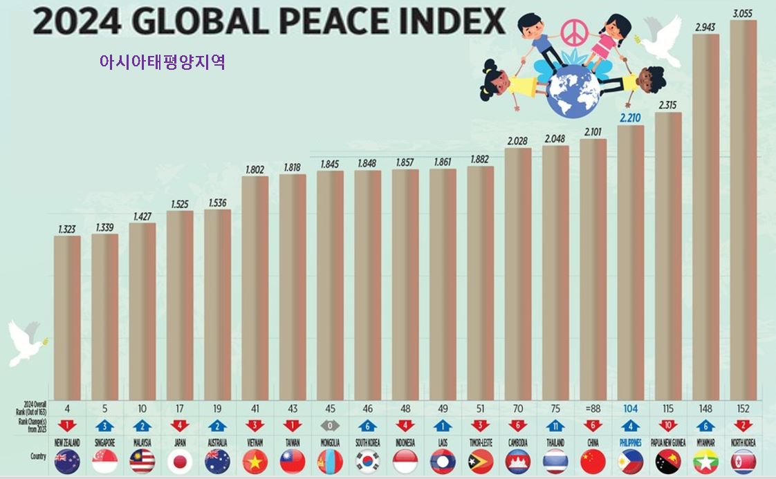 ● 아이슬란드 계속 가장 평화로운 나라 ● 리비아와 부룬디가 가장 큰 개선 ● 중동 및 북아프리카(MENA) 지난 3년 연속 크게 개선 ● 유럽은 여전히 가장 평화로운 지역으로 조금 더 개선 ● 아프가니스탄은 가장 평화롭지 않은 국가지만 많이 개선 ● 분쟁 사망 96% 증가 ● 러시아와 유라시아는 가장 가파른 악화 지역 ● 9개 지역 중 6개 지역이 악화 기록.