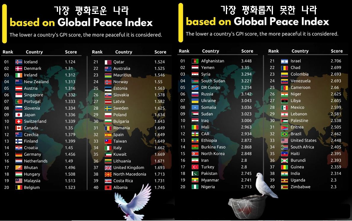 ● 1. 정부의 원활한 기능 ● 2. 건전한 사업환경 ● 3. 자원의 공평한 분배 ● 4. 타인의 권리 수용 ● 5. 이웃 나라와의 좋은 관계● 6. 정보의 자유로운 흐름 ● 7. 높은 수준의 인적 자본) ● 8. 낮은 부패 수준. 보고서는 각 핵심 요소에 대해 어떤 개입을 수행해야 하는지 구체적으로 명시하지 않는다. 특정 국가의 문화적 규범과 개발 경로에 크게 좌우되기 때문이다. 나라에 따라 개입 결과는 다를 수 있기 때문이다. 적극적 평화가 다른 평화 연구와 다른 점은 틀이 경험적 도출이라는 점이다. '적극적평화지수'는 평화의 긍정적인 특성을 정의하고 측정하는 가장 포괄적인 글로벌 정량적 접근 방식이다. 평화로운 발전과 개선을 위해 실행 가능한 플랫폼을 제공하기 위한 목적이다. 또한 지배 구조, 경제 발전, 평화 등 사회적 요소를 개선하는 데 도움이 되도록 하는 것이다. 평화로운 사회를 만들고 유지하는 긍정적인 요인을 식별하는 몇 안 되는 총체적이고 실증적인 연구 중 하나다. 2023년 한국은 전년 43위에서 3위 하락한 46위를 기록했다.