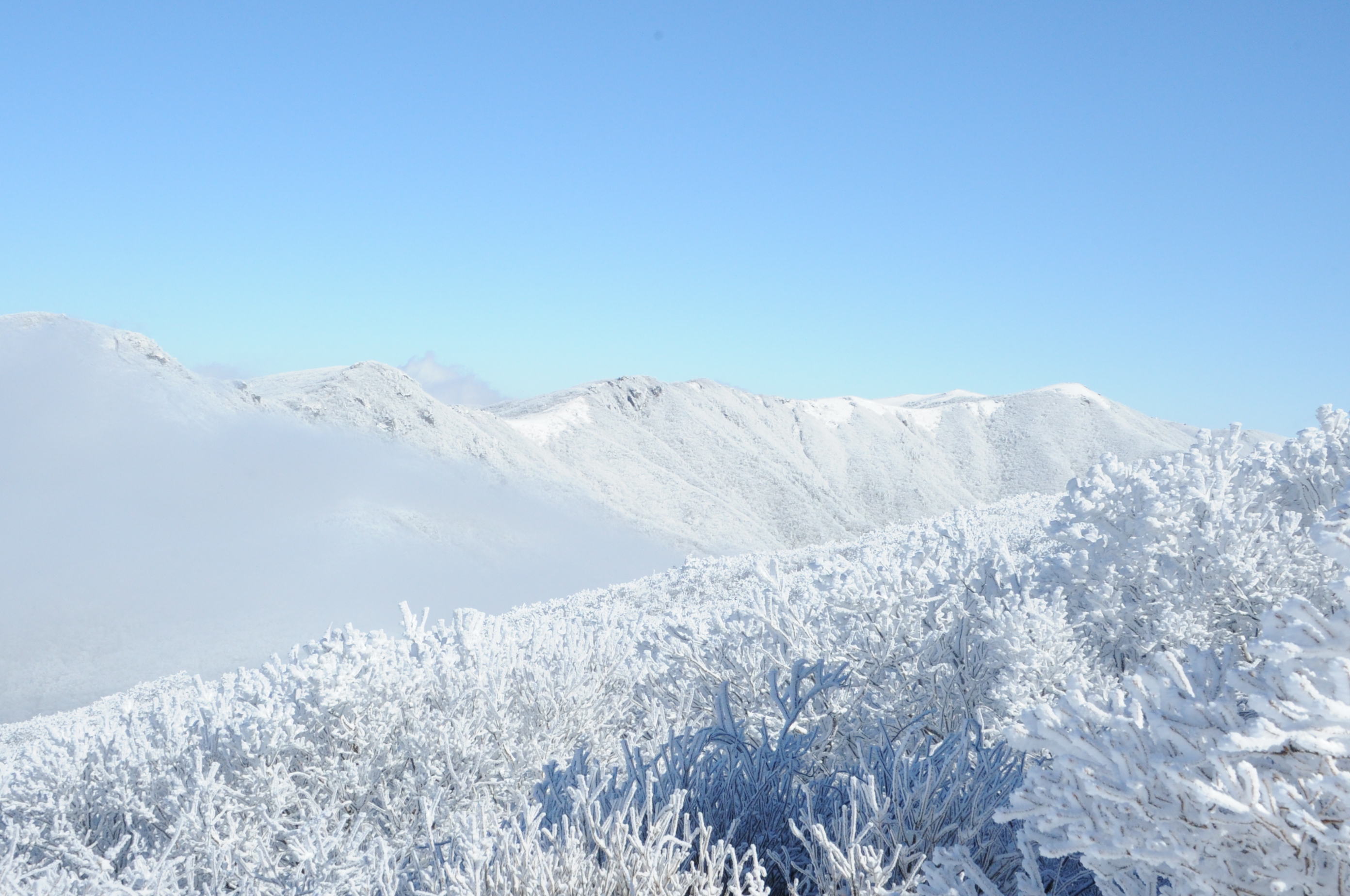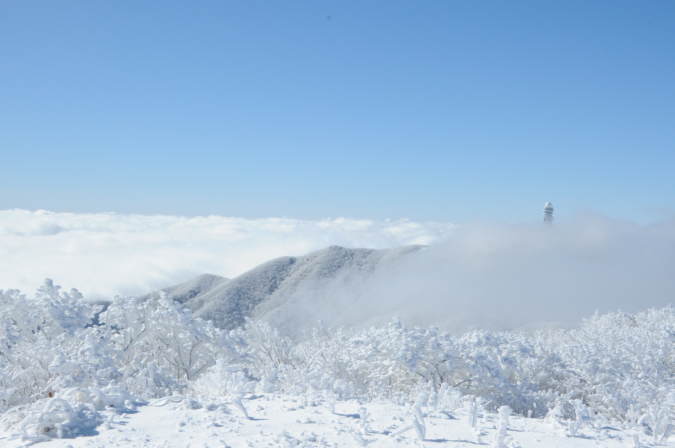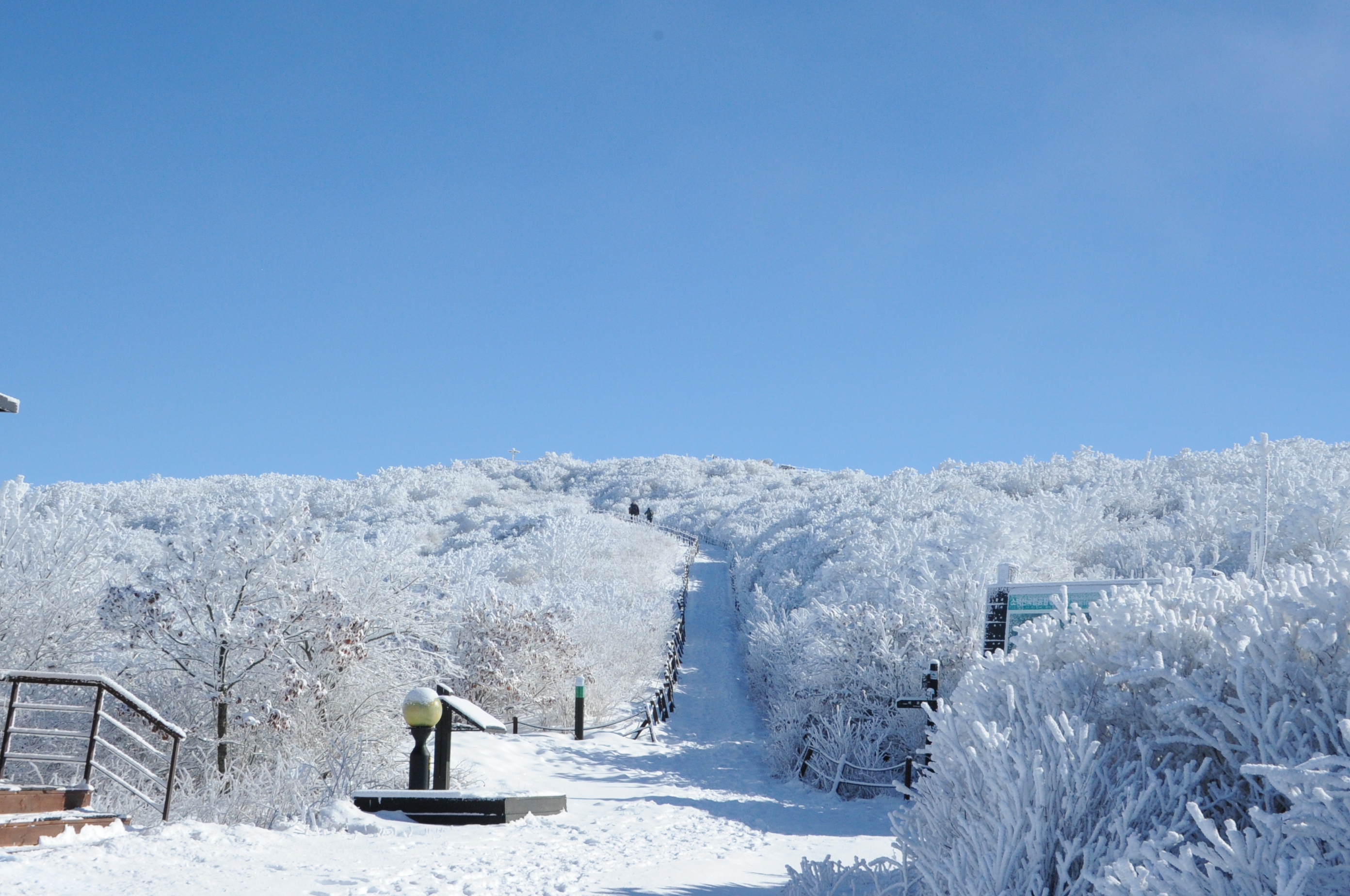 2023-01-16. 천안에서 새벽 6시에 아내와 함께 소백산 등정을 위해 출발하여 9시에 도착, 죽령 휴게소에 애마를 주차하고 시작되는 소백산산행, 처음부터 환상적인 상고대의; 향연에 감탄을 하다보면 4km 가다보면 제2 연화봉이 나오며, 여기에 환상적인 천문대가 구름속에 가려졌다 나왔다를 하면서 천상의 분위기를 연출합니다. 그 뒤로 계속 올라가다 보면 눙 속에 펼쳐지는 상고대와의 어우러짐과 함께 멀리서는 구름을 몰고온 칼바람이 옷깃을 여미게 하며 날아가는 구름사이로 보이는 파란 하늘의 모습이 장관을 연출합니다.