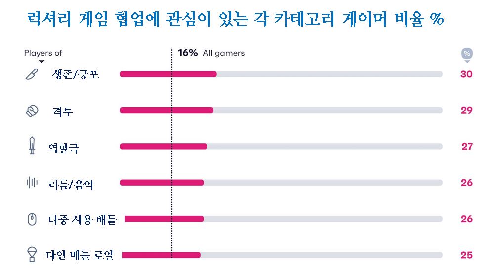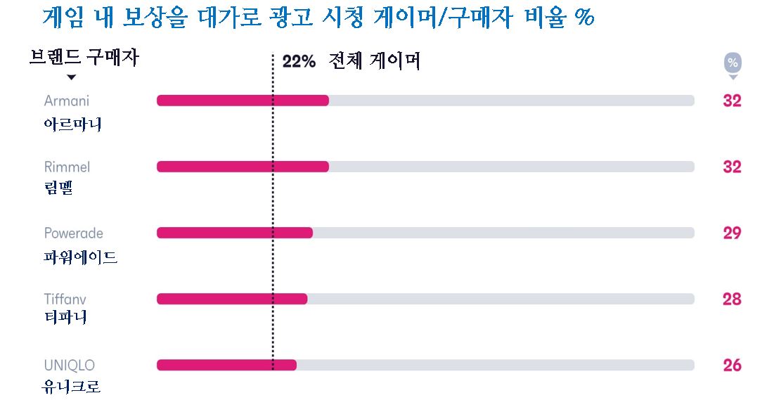특히 특정 카테고리에서는 럭셔리 게임 협업에 대한 강한 욕구가 생기고 있다. 서바이벌/호러 게임 매니아들은 이런 파트너십에 열광하며, 특히 레지던트 이블 플레이어 중 37%가 그렇다고 응답했다. 요즘은 공포 게임 주역으로 어울리는 여성 캐릭터가 인기다. 럭셔리 브랜드가 고도로 타겟화된 고참여 청중과 소통할 기회다. 럭셔리 게임 협업에 관심이 있는 사업은 캐릭터를 위한 가상 패션 아이템이 단연 1위고, e스포츠 상품, 게임 액세서리 등이 그 뒤를 잇는다. 게임 내 광고는 예상치 못한 집단 잠재력을 가지고 있다. 다양한 음료, 화장품, 의류 브랜드 구매자는 게임 내 광고를 보는 경향이 더 크다. 의류 유니클로, 장신구 티파니, 스포츠음료 파워에이드, 화장품 림멜, 심지어 명품 아르마니도 게임 내 광고에 열을 올리고 있다.