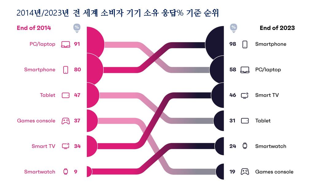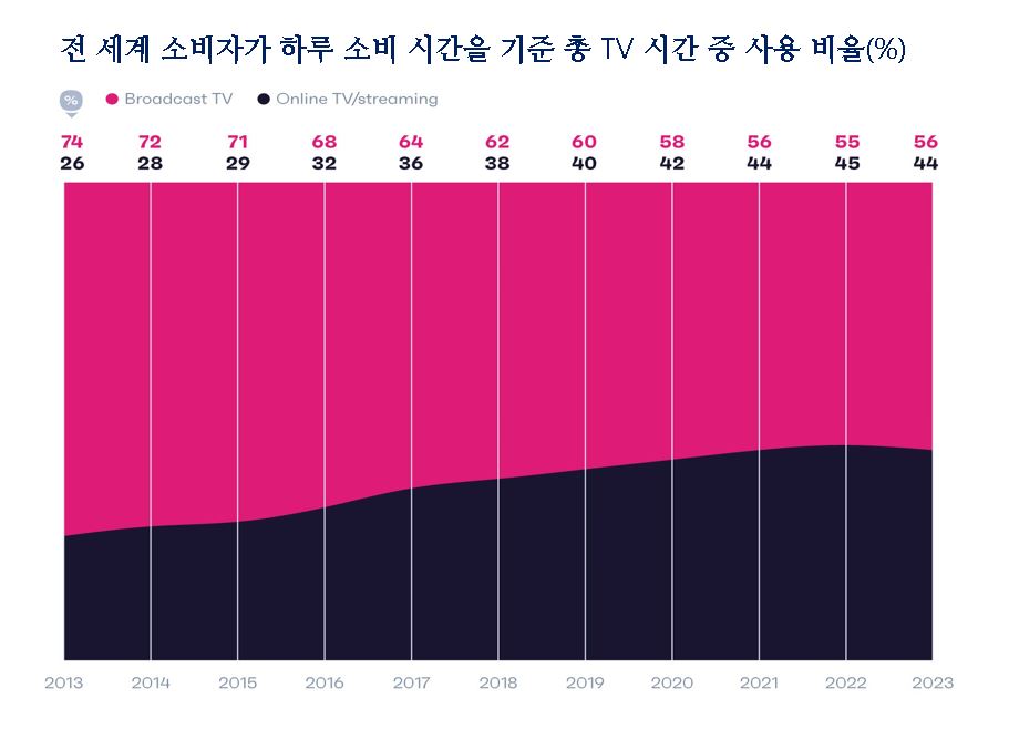 ● 스마트 제품이 다양해지고 있다: 미디어 환경을 지배하고 있으며 도미노 효과를 가져왔다. 지능형 기능은 스마트 기술을 더욱 주류로 만들었고 시계, 온도 조절기 등 장치는 계속해서 앱에 의존한다. ● 지난 10년 기기 보유 현황이 많이 바뀌었다. 2018년 스마트 TV가 태블릿을 추월했고, 2022년에는 스마트워치가 게임 콘솔을 앞질렀다. 2015년에는 미국/영국 Apple Watch 소유자 36%가 여성이었지만 현재는 57%이며 사용 사례가 확대되고 있다. 건강 /피트니스 추적이 가장 큰 용도이지만, Sony, G-Shock 브랜드 소유자 사이에서는 예능, 탐색, 소통이 1순위다. 앞으로 소비자는 일상적인 스크롤을 위해 더 작은 화면에 더 많이 의존하게 될 것이다. 이는 광고의 강력한 시각적 요소에 더 집중하고 텍스트 및 클릭 지표는 집중도가 떨어진다는 의미다. 스마트홈 제품도 영역을 넓혀가고 있다. 어린 자녀를 둔 부모(+22%) 또는 이혼/독신 여성 소비자(+27%) 그룹이 성장을 촉진하면서 지난 2년 자가용을 소유하고 있다고 말하는 사람의 수가 15% 증가했다. 잠재적인 마케팅 가능성이 급증하고 있다. ● 온라인 TV는 예전보다 총 TV 시간에서 더 큰 비중을 차지한다.