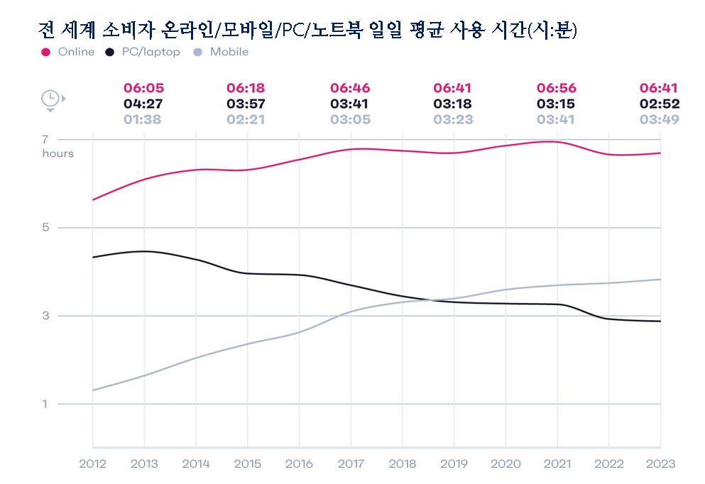 소비자는 온라인에서 점점 더 많은 시간을 보내고 있다. 코로나 봉쇄와 그 여파로 인해 새로운 정점이 발생했지만 일회성이었다. 지금은 사업 전문가들이 사무실로 복귀하고 AI와 같은 신기술이 우리가 사용하는 플랫폼에 합류했으며 예산 부족으로 인해 소비자는 구독을 다시 생각하게 되었다. 인터넷 사용량이 약간 감소했지만, 꽤 안정적인 상태를 유지할 가능성이 높다. 따라서 온라인에서 벗어나 무엇을, 어떻게, 왜? 집중하기 시작하는 것이 좋다. 평균 온라인 시간 소비는 크게 변하지 않지만 기기 사용/행동은 변화하고 있다.