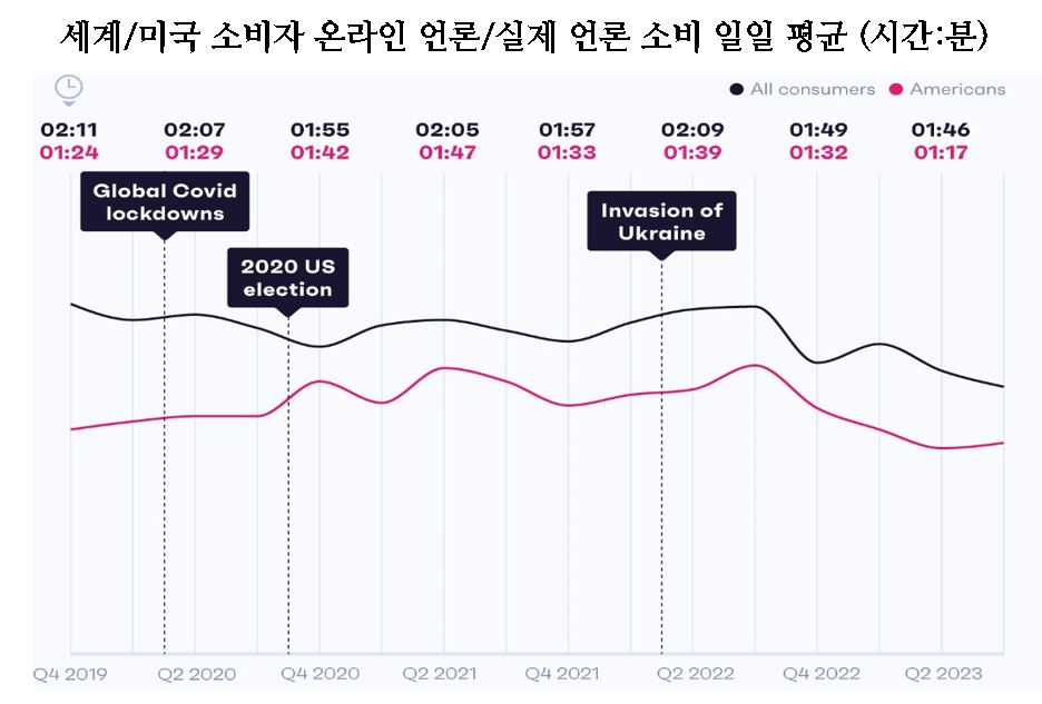 매우 불확실했던 팬데믹 초기 단계에는 뉴스 수요가 매우 높았다. 정부 브리핑이 역사상 가장 많이 시청 되는 프로그램 중 하나가 되었다. 지금은 전원을 껐다. 실제 인쇄물, 온라인 언론에 시간을 덜 쓰고 있다. 소비자 절반은 2023년 12월에 매주 뉴스를 피하려고 적극 노력하고 있다고 답했다.