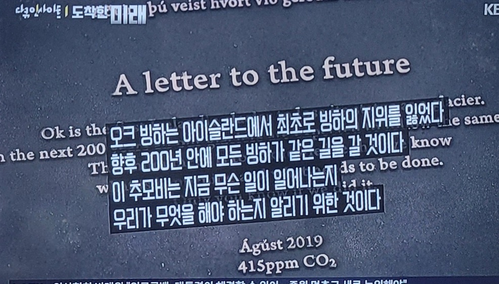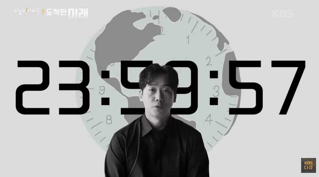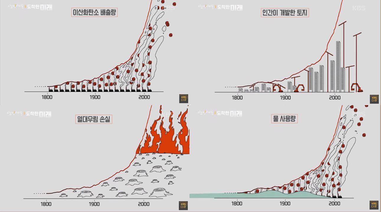 4월 18일 '도착한 미래' KBS '다큐 인사이트'를 주말에 다시 봤다. 45억 년 된 지구에 5번의 대멸종으로 지구종 3분의 1일 사라졌다. 임박한 6번 째는 순전히 인간종 때문이다. 지구 역사를 24시간이라면 23시 59분 57초다. 태양보다 뜨거웠던 지구는 억 년 전 물을 품은 행성과 충돌하여 바다가 생겨나고 생명이 탄생했다. 생태계 유지에 중요한 이산화 탄소도 생겨났다. 햇볕, 물, 이산화 탄소로 식물은 광합성을 한다. 식물은 동물 먹이가 되고 동물은 다시 대기로 이산화 탄소를 배출한다. 온실가스로서 방어막 역할을 한다. 24억 년 전 빙하로 덮였다가 2.5억 년 전 대규모 화산 폭발로 탄소 순환이 깨져 생명체 90%가 희생되었다. 이후 공룡의 시대를 거쳐 인류가 탄생했다. 농사가 시작되고 지구의 지배자가 되었다.