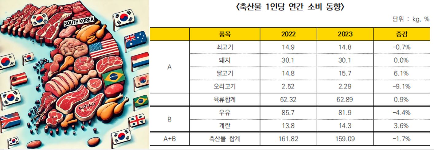한국인은 연 1인당 육류 소비량 중 절반은 돼지고기로 30.1kg, 닭고기는 15.7kg, 소고기는 14.8kg 오리고기 2.29kg 순이다. 2023년 육류 소비는 쌀 소비 앞서고 모든 양곡 소비량과 엇비슷한 상태다. 계란 소비 14.3kg으로 전년 대비 3.6% 증가했다. 연간 닭 도축량은 10억 1.137만 마리에 수입량 18만 2000 t까지 감안하면 1인당 연간 닭고기 소비 총량은 1인당 약 26마리가 된다. 삼계탕과 치킨 대중적이다. 원래 닭 수명은 8~13년인데, 식용 영계는 6개월에 불과하다. 28~33 일령에 잡아먹는 가혹한 대량 생산 때문이다. 산란계 수명은 80주로 비교적 길다.