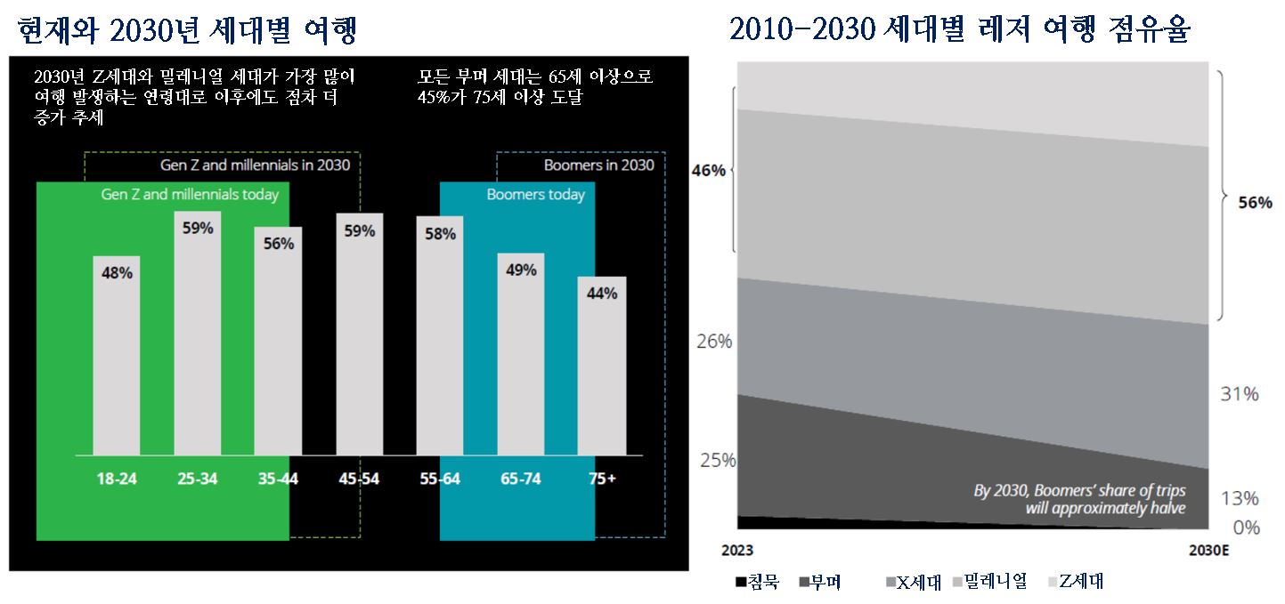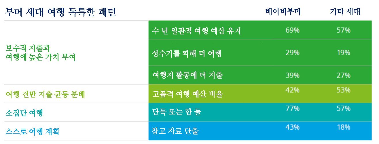 ■ 변화하는 여행객: 나이가 늘어나는 수익성 있는 부머 세대보다 젊고 기술에 익숙한 젊은 세대 여행이 꾸준히 늘며 두각을 보인다. 인도, 중국, 신흥국 방문객 유치가 늘면서 경제 환경에 따라 여행사/투자자가 고품격 여행에 치중하다가 대중 시장 기회를 놓칠 수 있다.