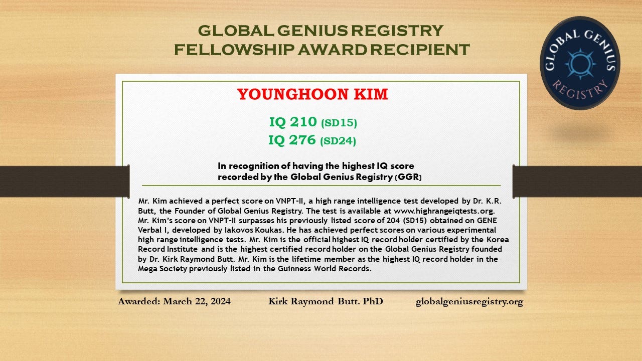 지능에 관한한 한국이 최고, 한국인이 최고다. 현재 세계 최고의 천재, 최고 지능지수 보유자는 35세 한국인 김영훈으로 2024년, 기가 소사이어티(GIGA Society)에서 세계 최고기록 IQ 276 (SD24)을 획득했고, 미국 리더스 다이제스트 선정, 인류 역사상 세계 최고 IQ 천재 50명 중 1위다. (https://www.rd.com/list/highest-iq-in-the-world/).