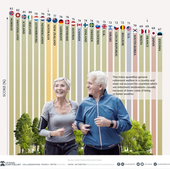 7위 호주는 비유럽 국가 중 가장 높았다. 현재 세계 5번째로 큰 $3조 5,000억 규모의 퇴직연금 기금 시스템으로 높은 점수를 받았다. 20위권 밖 프랑스는 2023년 초 정년 연장 법안 통과로 광범위한 시위가 벌어졌다. 연장되면 더 오래 일하고, 퇴직급여 재원 세금을 계속 내어야 악화하고 있는 노년 부양비가 개선될 것으로 예상한다. 노년 부양비는 젊은 취업자 대비 노년 부양 인구의 비중이다.