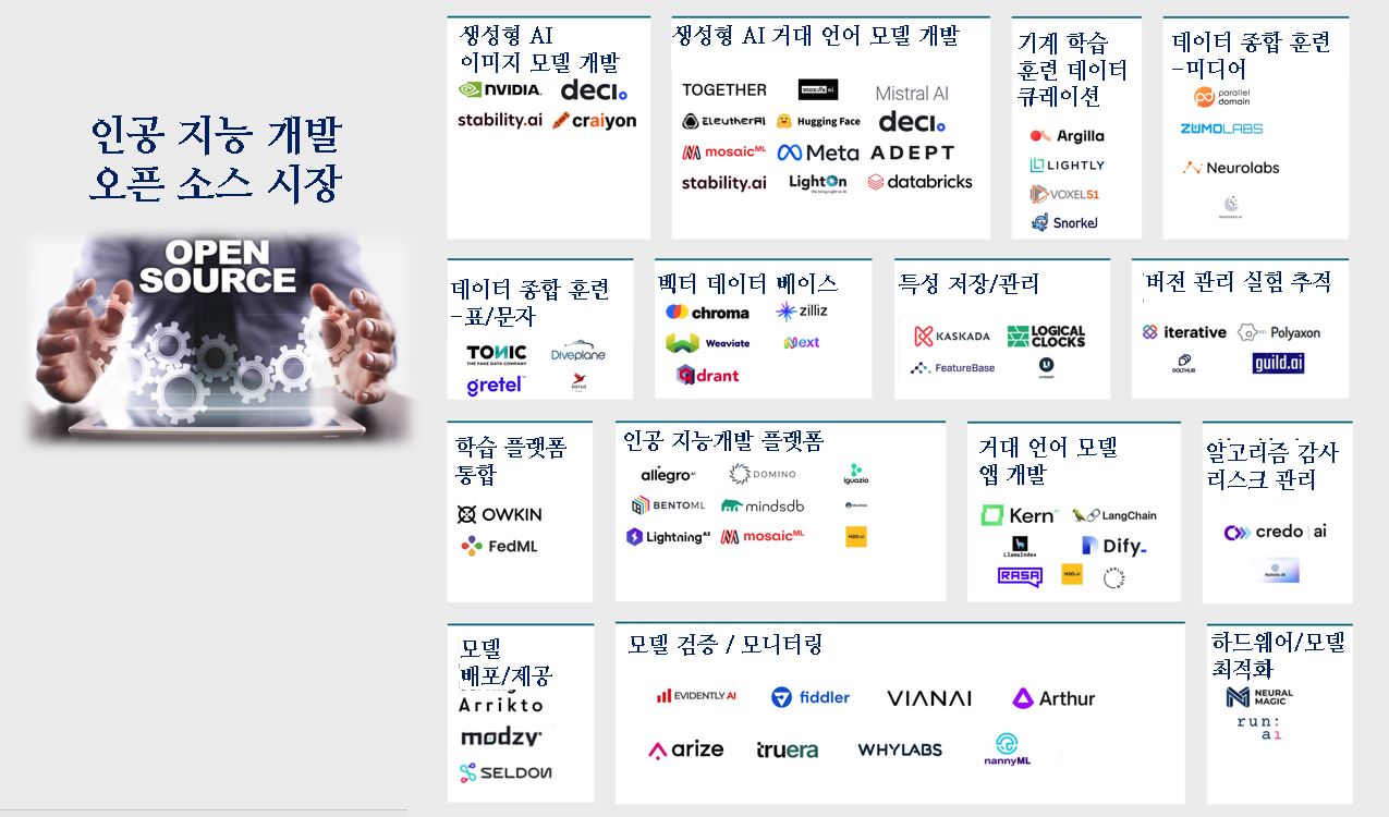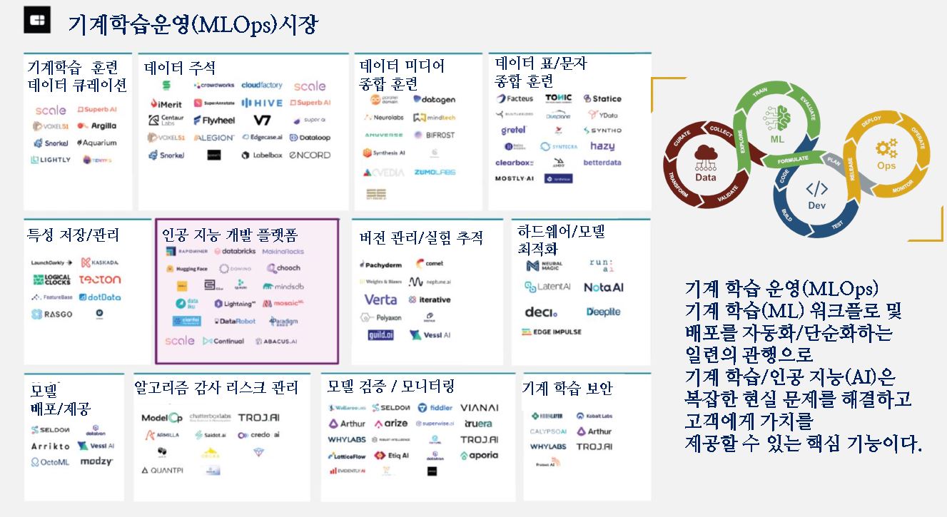 사내 AI 프로젝트를 개발하고 출시하려는 기업을 위한 원스톱 상점 역할을 한다. 일부 플랫폼 회사는 직접 경쟁하는 반면(예: 데이터 과학 워크플로우의 Dataiku, DataRobot), 보다 전문화된 플랫폼 기업도 있다(예: 데이터 준비에 중점을 두지만 GenAI 개발 플랫폼도 제공하는 규모). 다양한 기업/조직이 AI 개발 플랫폼의 고객사다. MLOps(기계 학습 운영) 환경은 12개 범주에 걸쳐 130개 이상 회사가 시장을 이룬다.