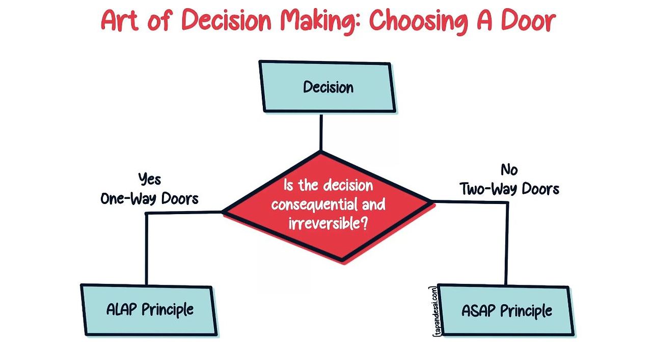 '양방향' 결정은 ASAP(As soon as possible) 원칙: 가능한 한 속도 우선이다. '일방통행' 결정은 ALAP(As late as possible)원칙: 심사숙고가 더 중요하다.