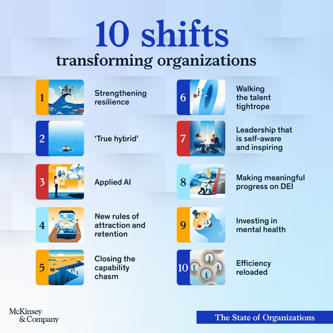 연초에 직원들에게 전했던 내용을 10월 다시 짚어주었다. 보다 효율적이고 지속 가능한 성장을 추구하려면? 지속 가능한 성장에 필수적인 전략적 접근이 요구된다. 'McKinsey & Company'는 오늘날 기존 조직의 운영/관리에 중요한 영향을 미치는 10가지 주요 변화를 정리했다. 조직이 성공적으로 운영되고 경쟁력을 유지하기 위해 고려해야 할 중요한 요소다. 이러한 변화에 어떻게 적응하고 발전해가야 할지를 제시한다. 2022년 5~6월 9개 국가, 16개 산업 분야의 천 명 이상 직원 보유 기업의 관리자/리더 2,500명을 대상으로 조사한 결과다