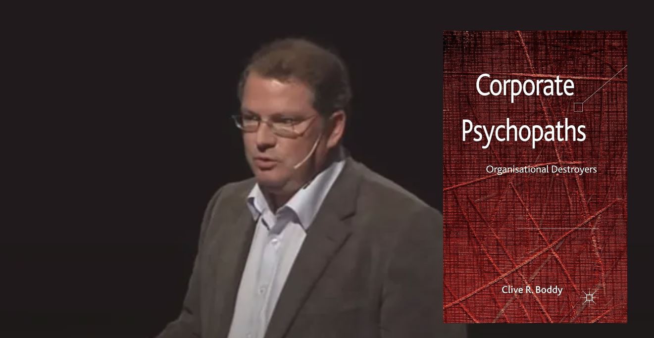 클리브 보디 교수는 70명 규모의 비영리 단체 CEO가 된 명백한 한 사이코패스 사례 연구를 발표했다. 취임 몇 주 안에 해로운 대가를 치르기 시작했고, 근무 기간 내내 더욱 심해졌다. 모금액, 생산성이 떨어지고 병가가 급증했다. 원성을 샀지만, 정치 경력의 발판으로 더 빠르게 사다리를 오르거나 다른 조직으로 갈아타려는 기회로 활용했다. 2012년 Personality & Social Psychology 저널에 발표된 연구에 따르면 시어도어 루즈벨트와 존 F. 케네디 대통령은 가장 사이코패스 성향이 짙었다고 평했다. 2008년 금융 위기도 이런 경영진을 고용했던 금융기관들 때문이었다.